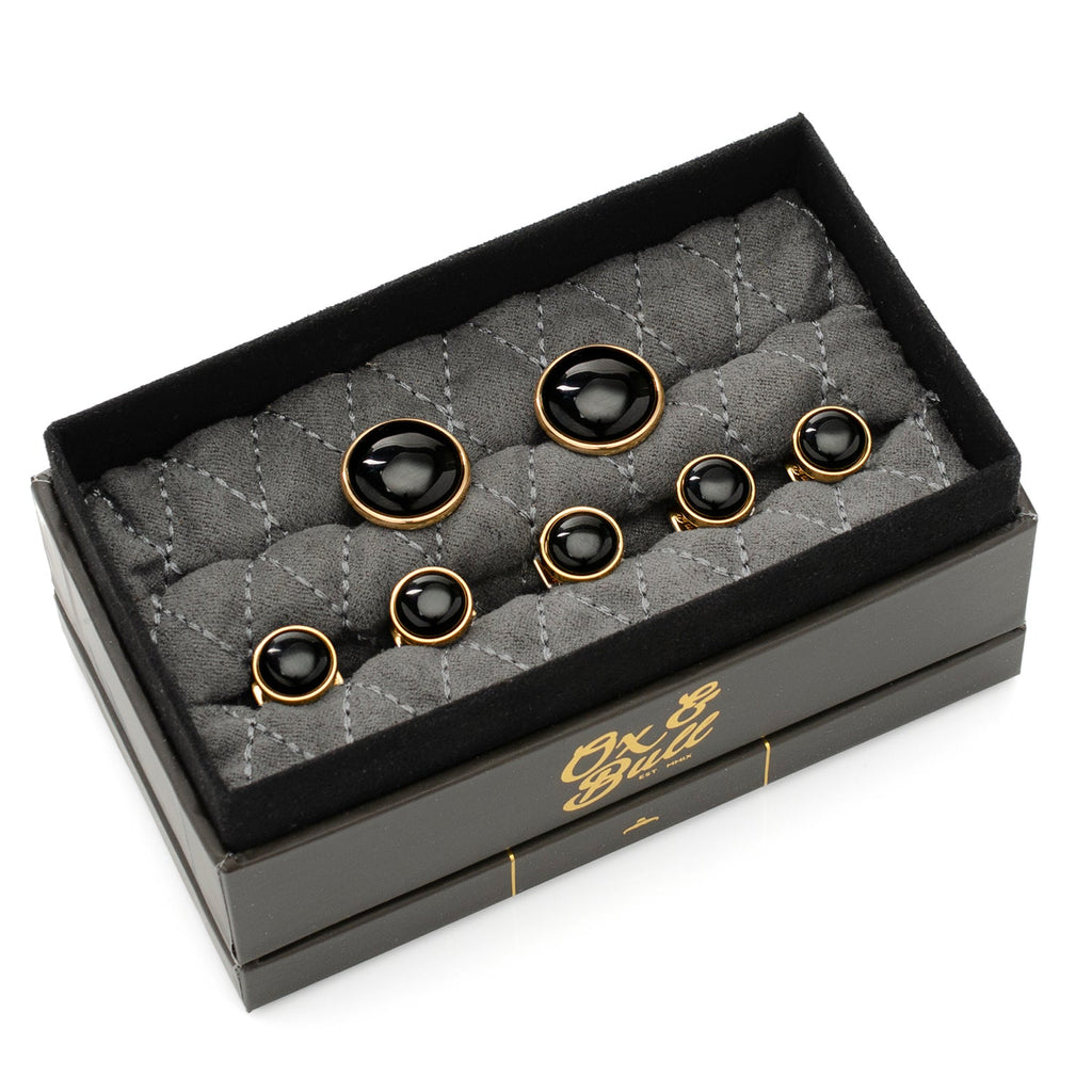 Classic and chic, our Gold and Onyx 5-Stud Set grants an immediate ensemble boost to your formal wardrobe. Smooth, deep Onyx discs nestle inside gold-finished settings for a simple, classic look suitable for any event. The expert craftsmanship of our base metal stud set ensures long-lasting durability. To add an additional boost, pair this set with our Gold and Onyx Inlaid Tie Clip for a finished look.