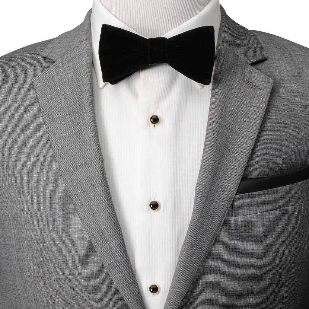 Classic and chic, our Gold and Onyx Studs grant an immediate ensemble boost to your formal wardrobe. Smooth, deep Onyx discs nestle inside gold-finished settings for a simple, classic look suitable for any event. The expert craftsmanship of our base metal studs ensures long-lasting durability. Wear alone or pair with our matching Gold and Onyx Cufflinks.