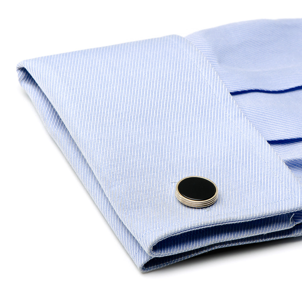 Keep a modest yet elegant style with these gold plated and Onyx cufflinks. The round cufflinks have the Onyx in the center with a ribbed gold border.