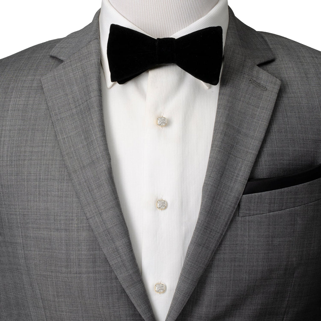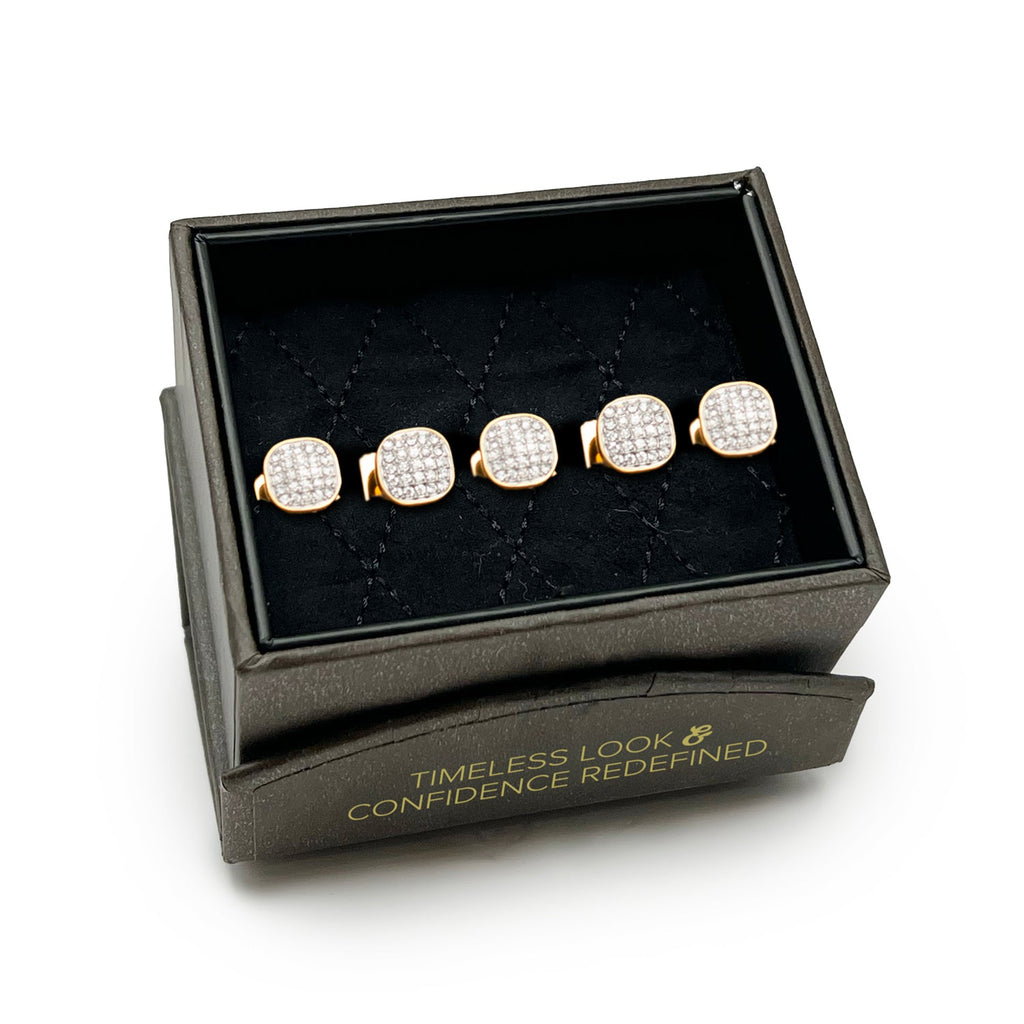 Perfect for your next formal event, these gold tone tuxedo studs set with pave Preciosa white crystals are a dazzling accessory with a luxe feel. Pair with the matching stainless steel cufflinks to complete your black tie look.