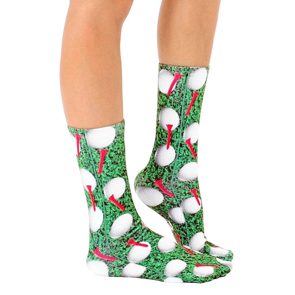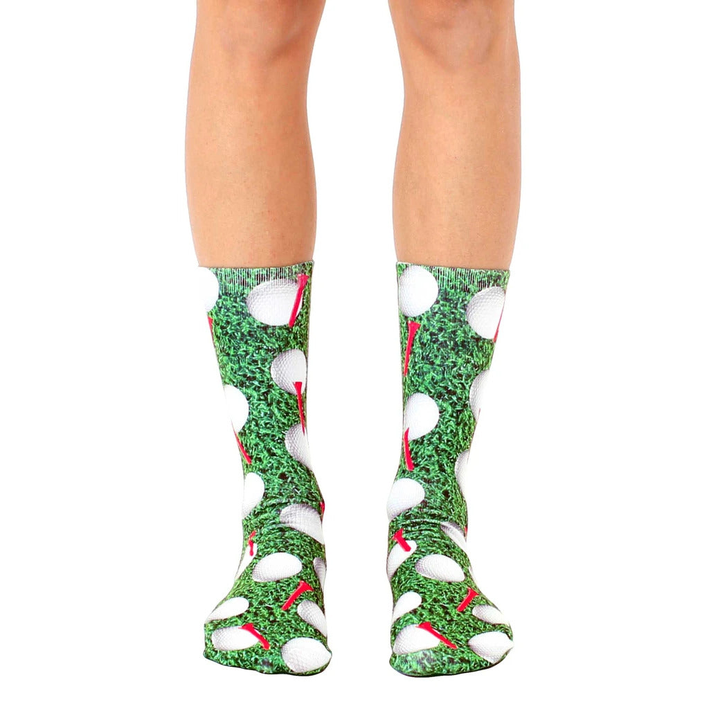 Gear Up for Fairway Fun: Step into the green with our Golf Crew Socks. These socks are as cheerful and vibrant as a sunny day on the links. The green background resembles a lush putting green, while the white golf balls and red tees add playful flair. They're perfect for recreational golfers, avid fans, and those who have a hole-in-one sense of humor. They also make delightful gifts for the golf enthusiasts in your life. Get ready to ace your sock game and hit a hole-in-one in style with Golf Crew Socks.