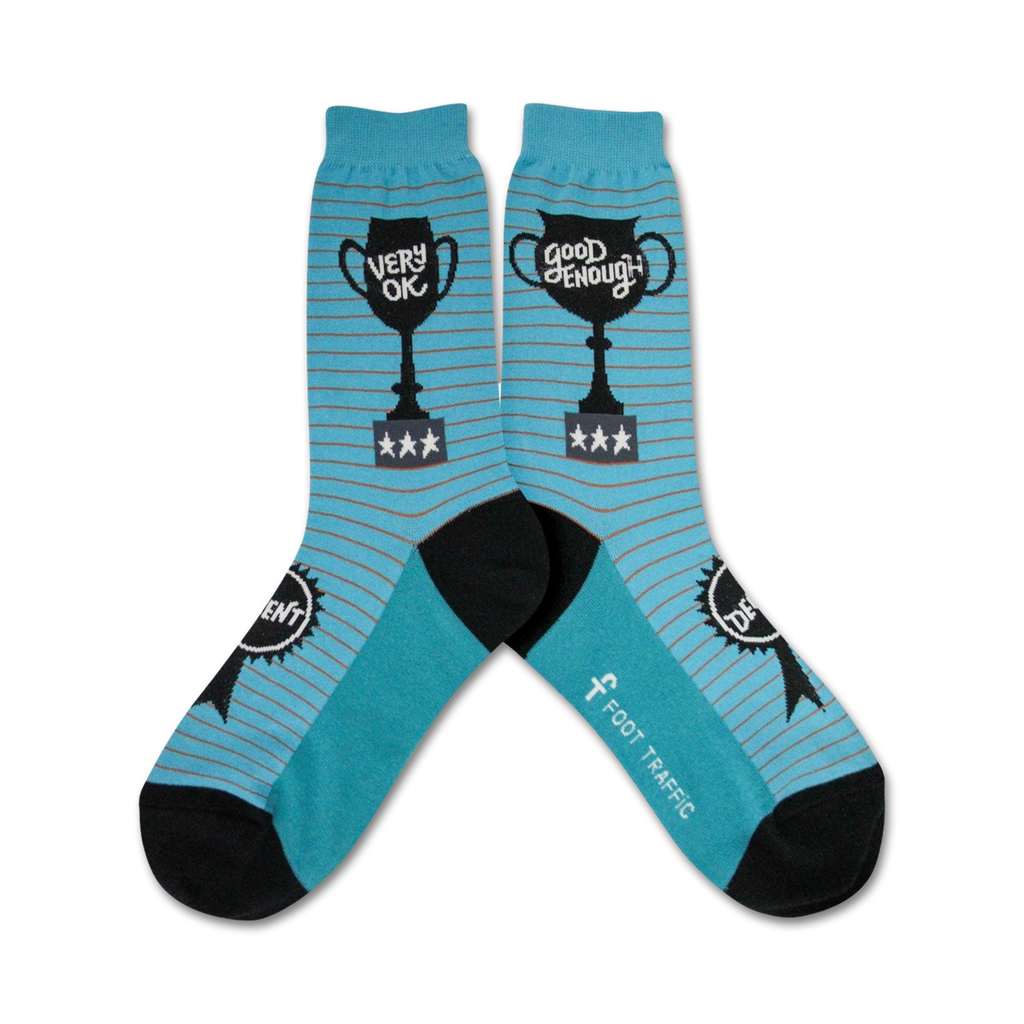 Strut you stuff with a pair of 'GOOD ENOUGH' socks that are VERY OK! Show off your perfect participation trophy status with these blue socks that feature black toes and heels. Whether you're running a marathon or just running errands, these comfy crew socks will remind you that sometimes, good enough is just that - good enough!