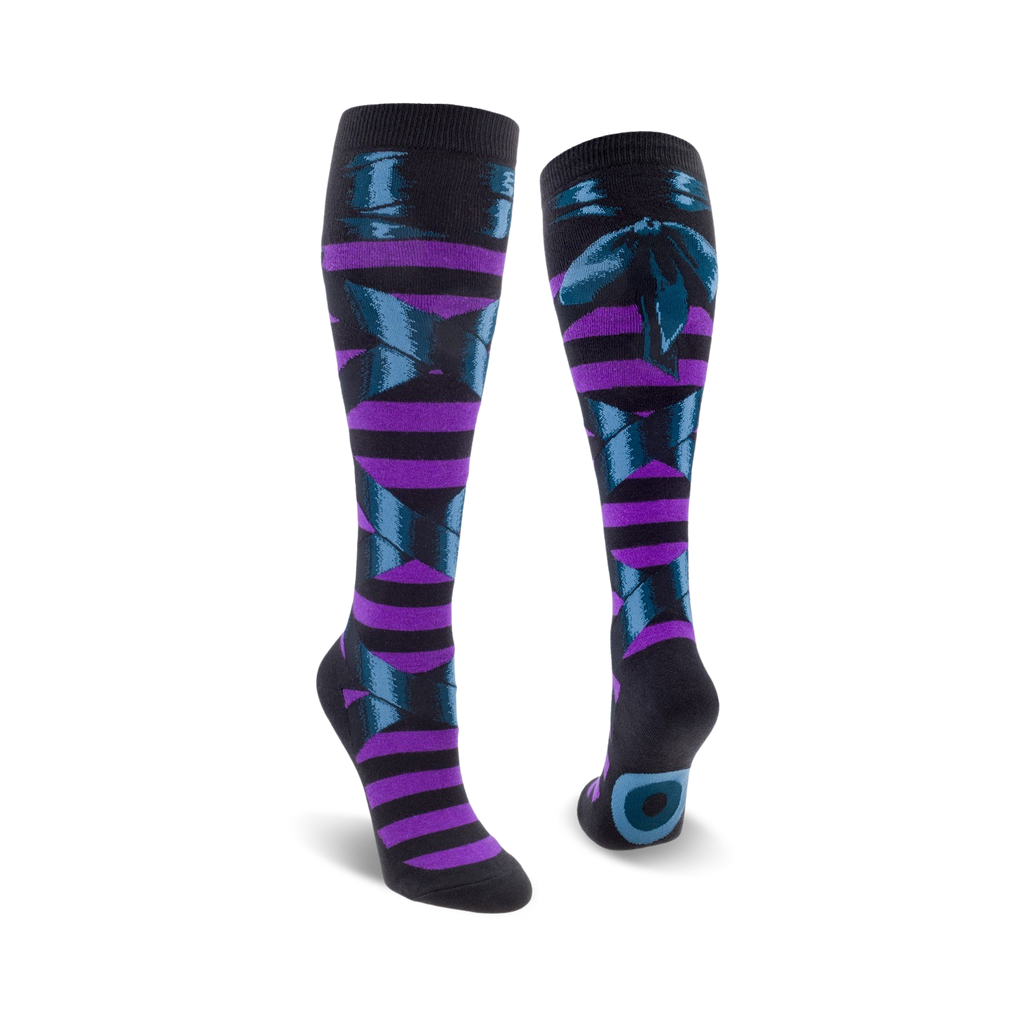 Dance like a dark sorceress in these knee-high Goth Witch Ballet Slippers socks. Feel the power of the night as the purple and blue ballet slippers dance up your legs. These socks aren't just for Halloween; they're a fashionable way to show your love of ballet and your unique style. Plus, they're a great conversation starter. Can you do a pirouette while wearing them?