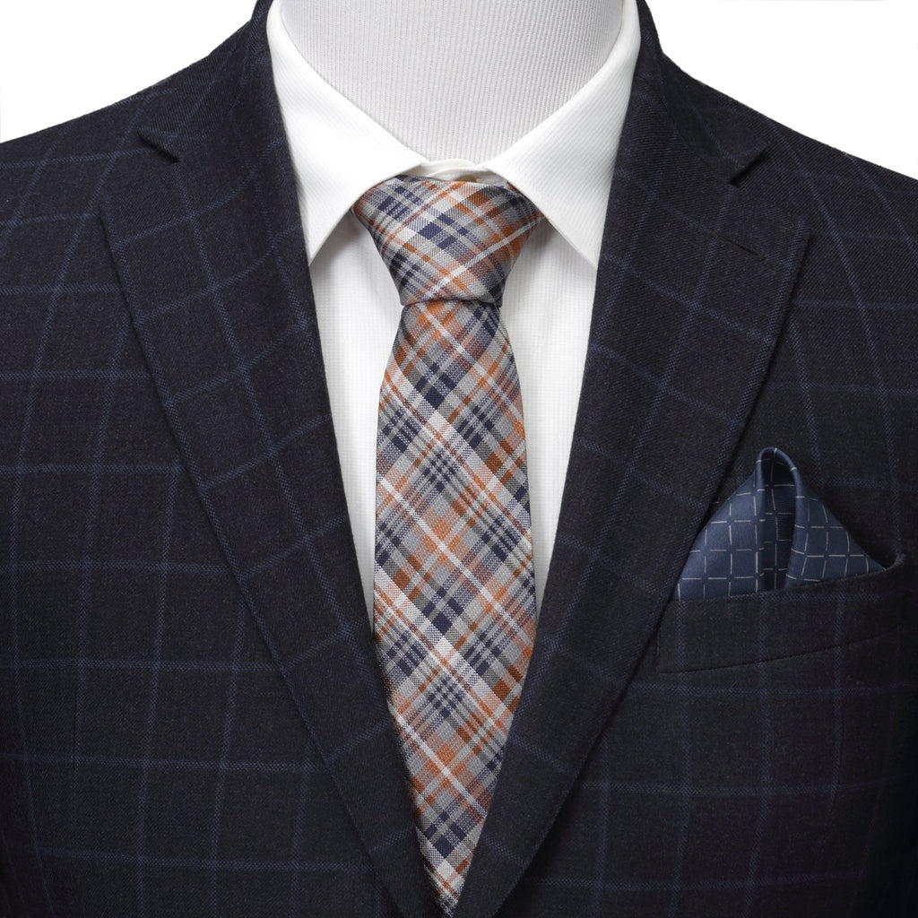 This 100% silk tie weaves gray, navy, and burnt orange in a plaid pattern. The combination of colors allows for versatile wear and a variety of styles to pair it with. A perfect tie for both professional and casual events.