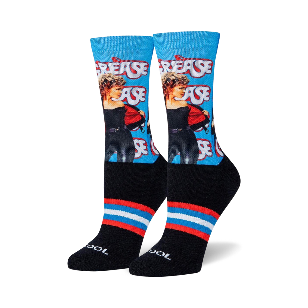 Grease up your wardrobe with these socks that'll make you wanna tell everyone to "go grease lightnin'!" Each pair of these black, blue, and red-striped socks features a fun pattern of Sandy from the hit musical, Grease! These crew-length socks are sure to make the most magical time of the year feel like "summer lovin'."
