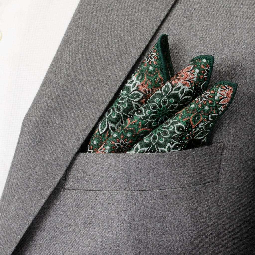 A gift set with a unique and mesmerizing design, our Green Floral Tie and Pocket Square Gift Set features a coral and green kaleidoscope pattern. Our tie will maintain its shape and hold a perfect knot thanks to the durable yet soft 100% Silk. Our pocket square will retain its shape in whatever fold you make thanks to being crafted with durable yet soft 100% Silk. It is a versatile set for any event.