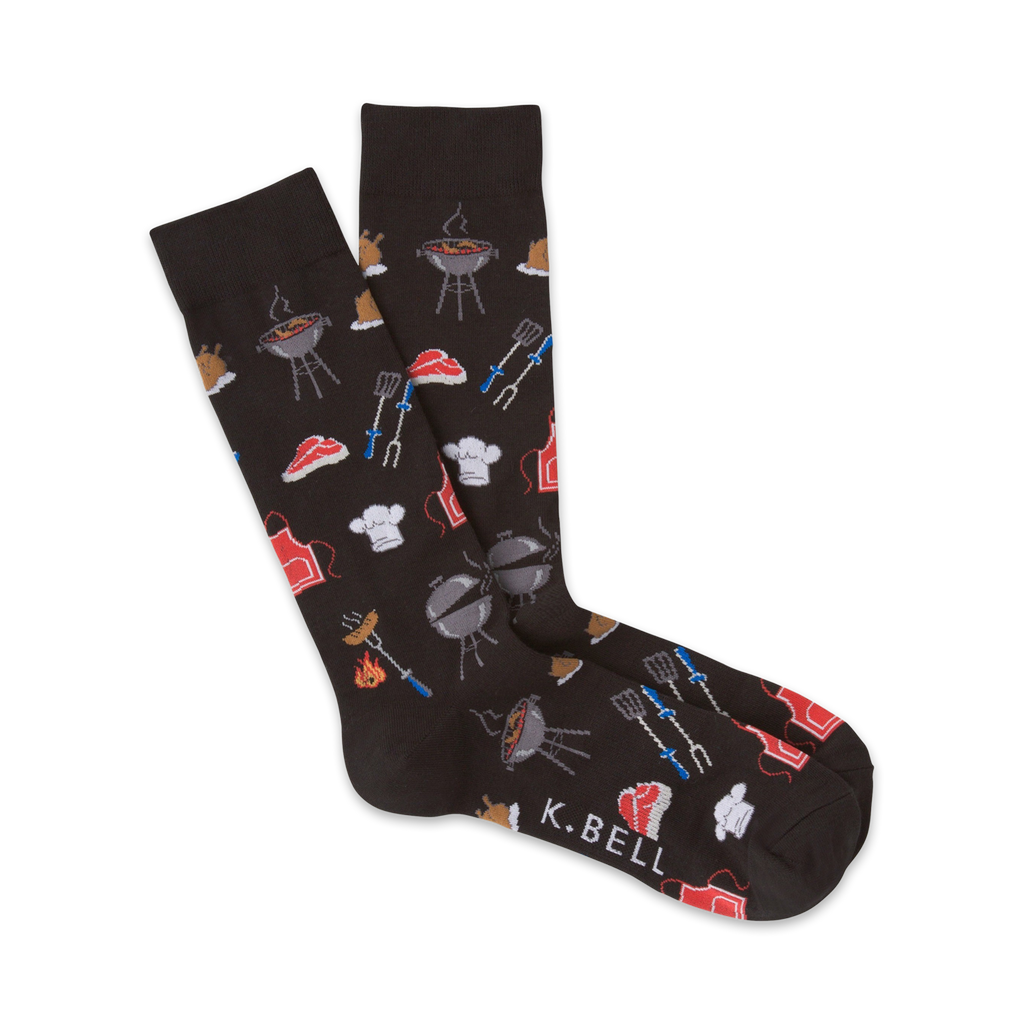 Be at the center of attention at the next BBQ event when you slip on a pair of these fun men's novelty crew socks. Whether you love to grill kebabs, shrimp, steaks, or burgers, these cool socks will have everyone's mouth-watering. Each awesome pair features aprons, grills, chef hats, and grilling tools printed all over on a black background.