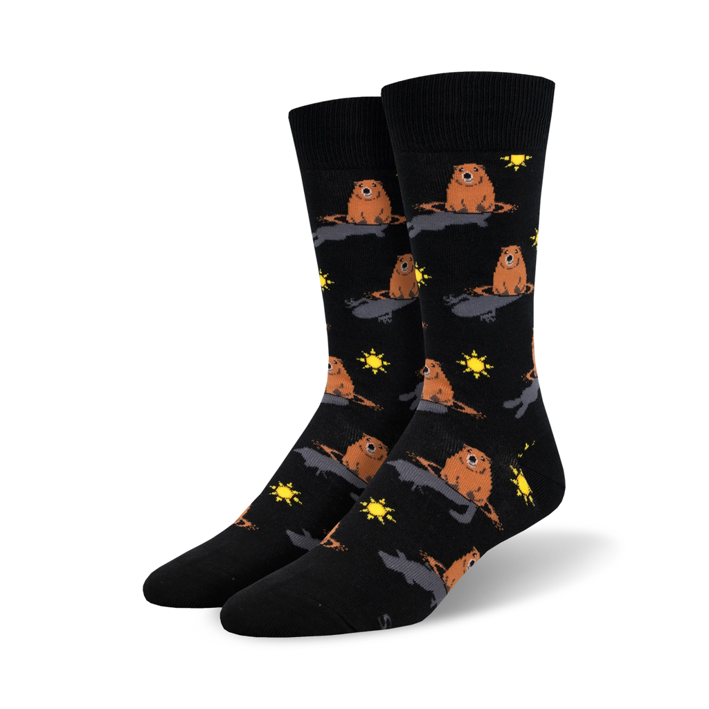Beep, beep! Catch a glimpse of the incredible groundhogs popping out of their holes in the ground. These socks feature brown groundhogs and black holes set against the backdrop of a radiant yellow sun. Perfect for any groundhog lover. Remember Punxsutawney Phil? Remind yourself that spring is just around the corner each time you put on these crew length men's socks.