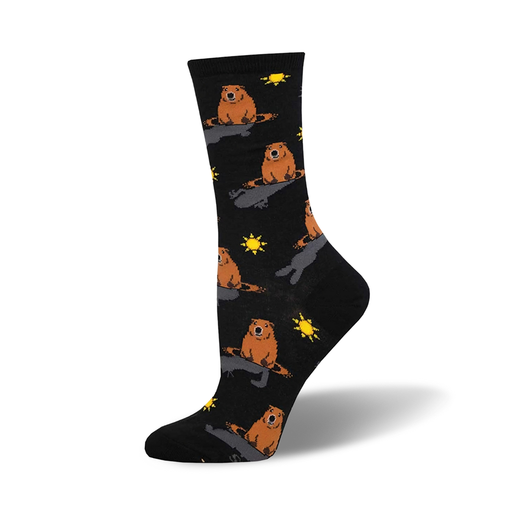 These black crew socks for women feature a fun pattern of repeating groundhogs and suns perfect for anyone who loves this cute and curious creature. Groundhogs are known for their ability to predict the weather, so wear these socks on Groundhog Day for a touch of good luck!