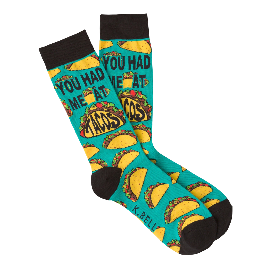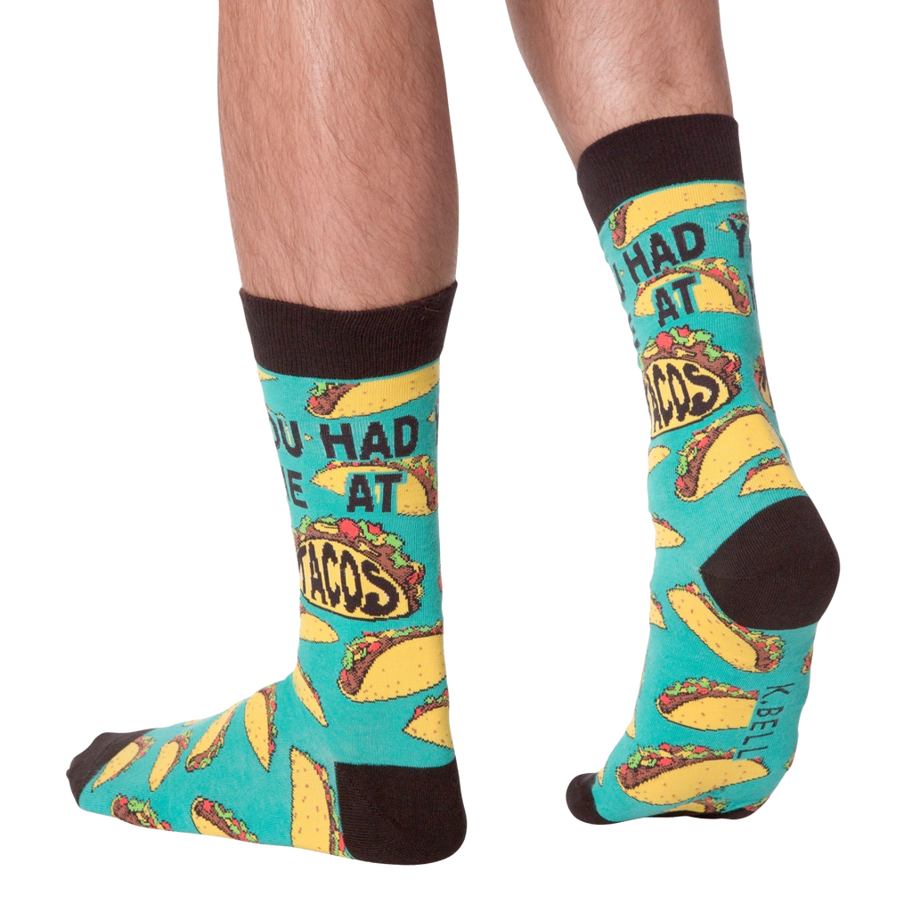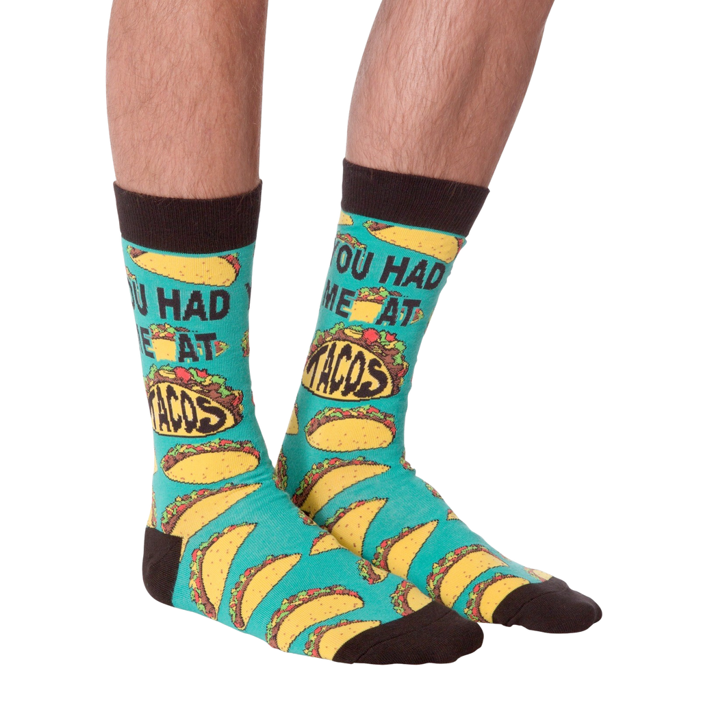 Don't let taco 'bout it, wear it! Accompany your next taco Tuesday get together with a snazzy pair of taco crew mens green and white cotton-blend novelty dress accessory. You'll have your fellow taco-holics green with envy and asking where you picked these spicy kicks up; you can tell them you 'taco'd' the opportunity to grab a pair at your local novelty sock shop. And remember, it's not just any taco; these fun dressy crew length kicks have the words 'You 'Taco'd Me At Tacos' printed across them so you can 'taco' 'bout your love of this tasteful treat, and maybe even get a late-night craving or two going with your foodie friends during a get together.