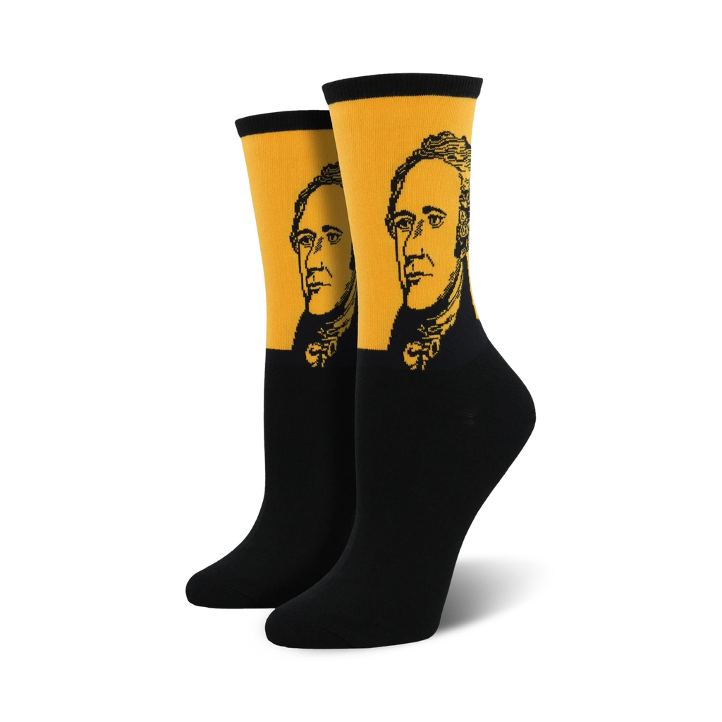You say "Hamilton," we say socks! That's right, these socks, like the great man himself, are a force to be reckoned with. In a stunning black and gold, adorned with a portrait of Alexander Hamilton, these women's crew socks are perfect for any fan of the Broadway hit. Wear them to your next history lesson, or just to show your love for the Founding Fathers. Fun fact: Hamilton was known for his sharp wit and eloquent speeches. Just like these socks are known for their sharp style and ability to get people talking.