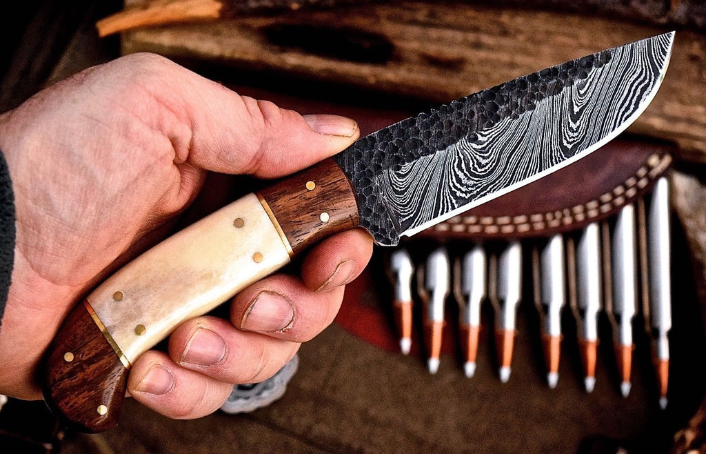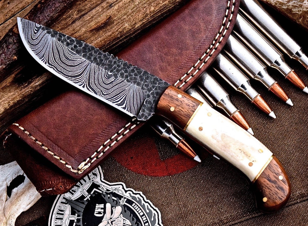 Experience the perfect blend of functionality and artistry with our Custom Hunting Knife. Expertly handcrafted, this knife boasts a 4.5-inch blade made from full tang hand-forged Damascus steel, ensuring both exceptional strength and stunning aesthetics. With an overall length of 9 inches, it offers the ideal balance for precision and comfort during your hunting adventures. The handle, crafted from a combination of rosewood and bone, provides a beautiful grip that enhances durability and control. Each knife comes with a quality leather sheath for safe storage and easy transport, making it a must-have for any hunting enthusiast.
