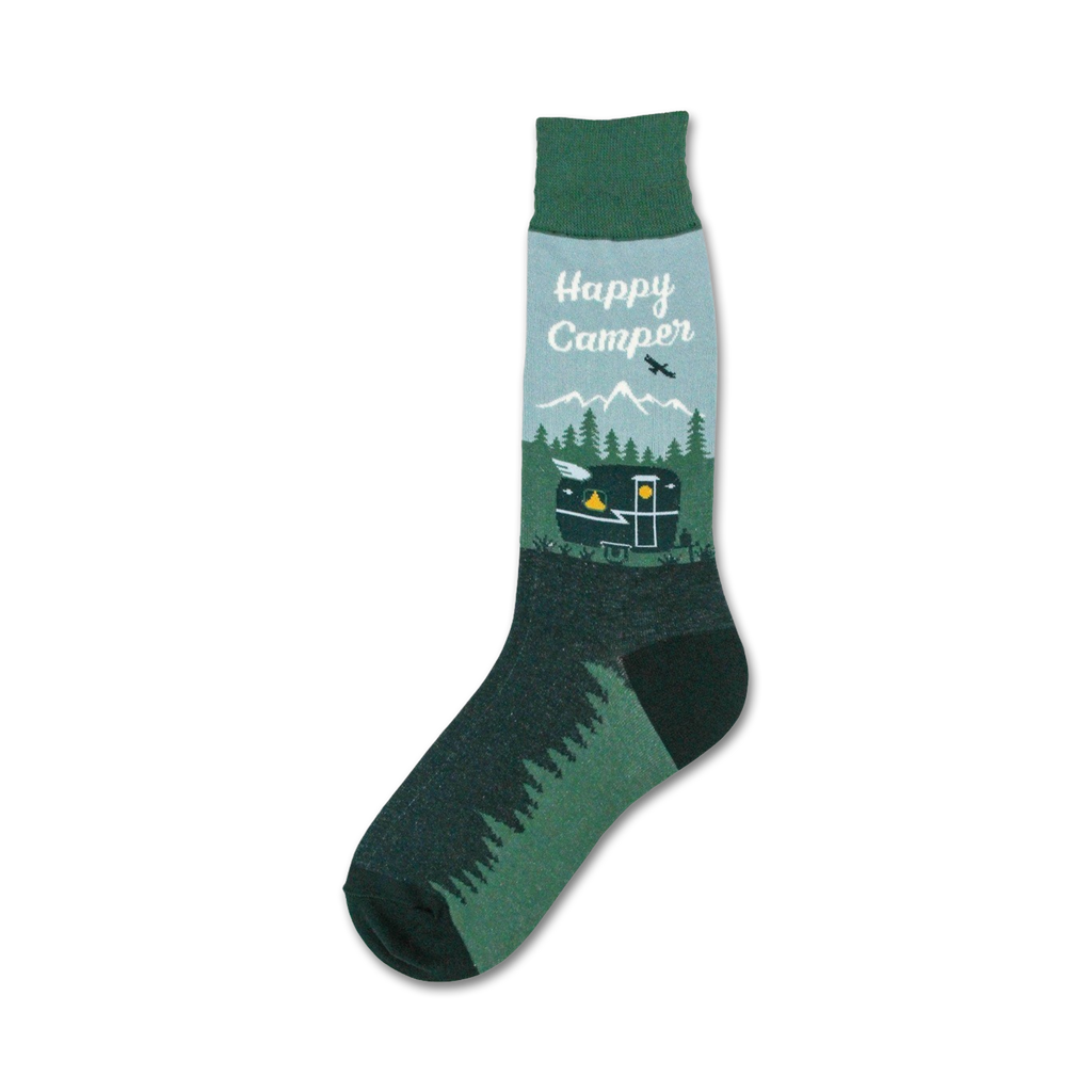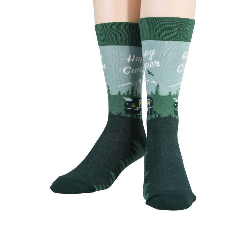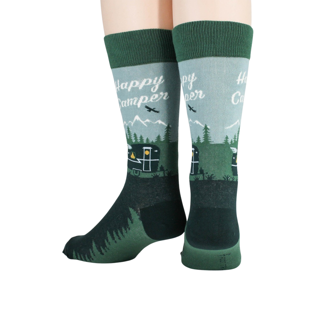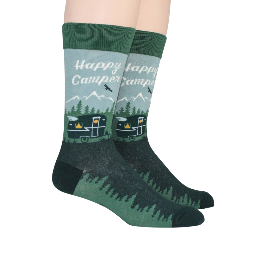You can't keep a good camper down, even when they're just lounging at home in these Happy Camper socks. With their lush forest green background, white mountain peaks, and pop of yellow, these socks are sure to put a smile on your face, and they're the perfect accessory for your next outdoor adventure.