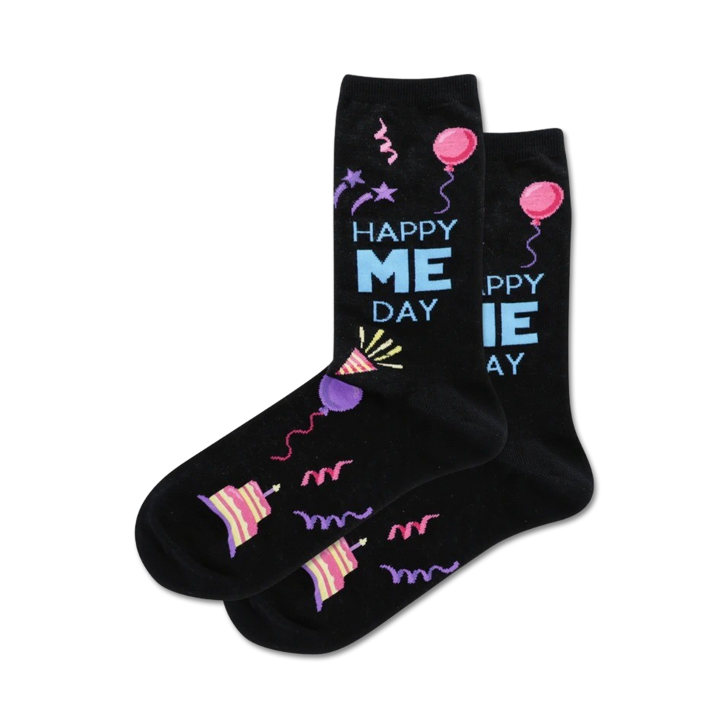 Celebrate your special day in style with our Happy Me Day socks! These eye-catching socks are bursting with party vibes, featuring a vibrant pattern of stars, balloons, streamers, and cupcakes. With the words "Happy Me Day" emblazoned across the toes, these socks are the perfect way to add some extra fun to your birthday festivities. So slip on a pair of Happy Me Day socks and let the celebration begin!