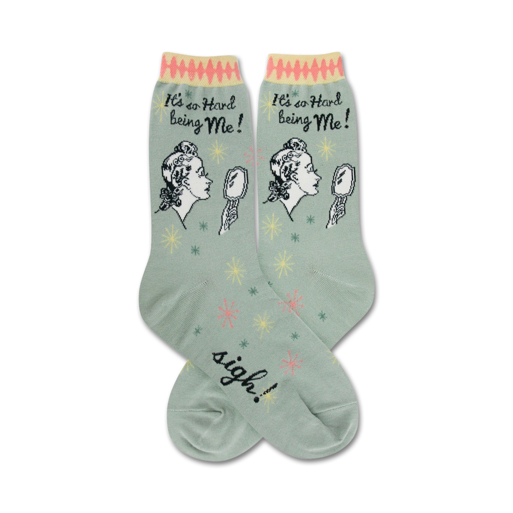Anyone who's ever found themselves mirroring a melodramatic sigh can now wear their heart on their sleeve or rather, their sass on their feet. These vibrant green "Hard Being Me" crew socks sport a charming illustration of a woman eye-rolling at her reflection. Adorned with the words "It's So Hard Being Me!" these socks are perfect for days when you're feeling playfully dramatic or need that extra bit of flair for your ensemble. Hosting a girls' night in or strutting into a casual Friday? Let these socks tell the world exactly how tough (or how fun) being you can be! Why not grab a pair today and flaunt your beautiful burdensome self?