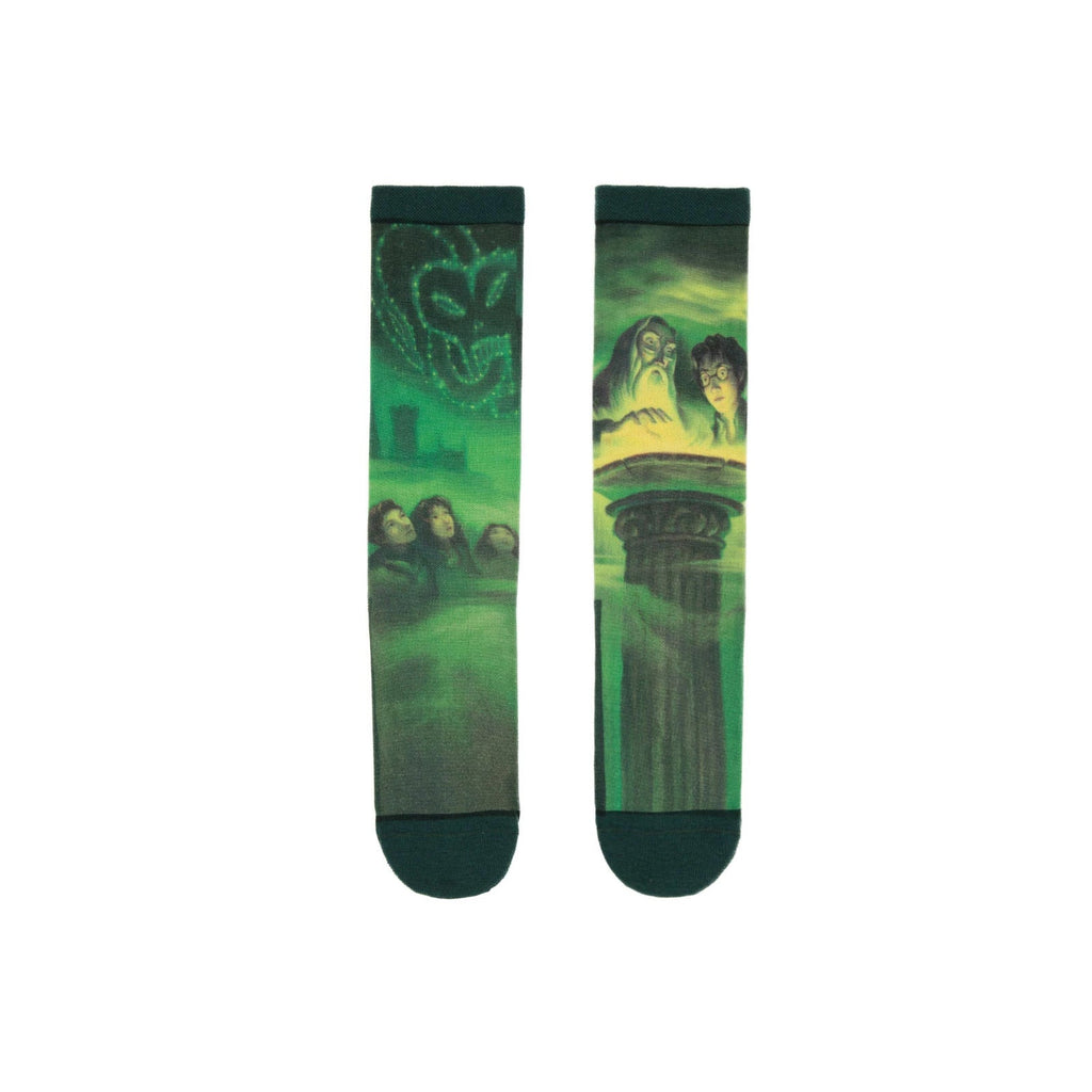 Avada Kedavra your boring sock game with these Harry Potter and the Half-Blood Prince novelty socks! Featuring a vibrant green and yellow pattern depicting the iconic scene from the book and movie, these socks will make you feel like you're right there with Harry, Ron, and Hermione. Perfect for any Potterhead, these crew socks are sure to bring a touch of magic to your everyday wardrobe.