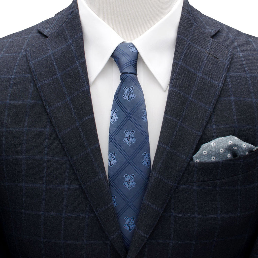 The iconic coat of arms of the Hogwarts School of Witchcraft and Wizardry is intricately woven into a sophisticated window-plaid pattern on the Hogwarts Blue Plaid Tie. Made of 100% silk, this monochromatic blue tie is versatile for everyday wear while also subtly showing your Potterhead geekiness.