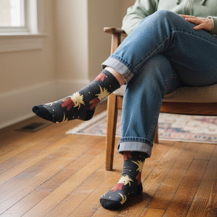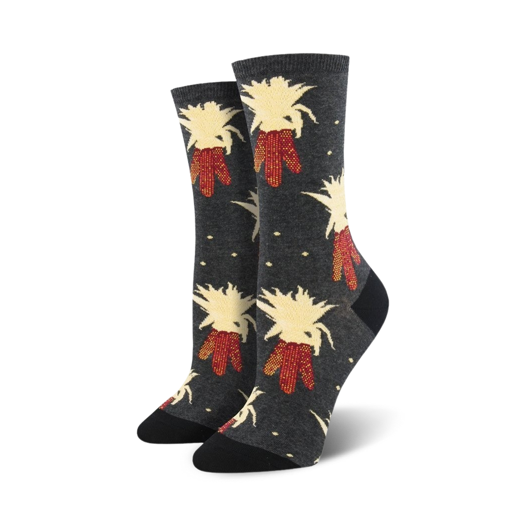 Feast your toes on Harvest Corn Crew Socks! These tasty socks are sure to make a "stalk"-ment whether you're cooking up a Thanksgiving feast or just craving some corny humor. With a dark gray background and vibrant red and yellow corn, you'll be serving up style wherever you go. And the best part? They're like your favorite casserole: amazing, but good for you too! Women's crew socks with a Thanksgiving theme.