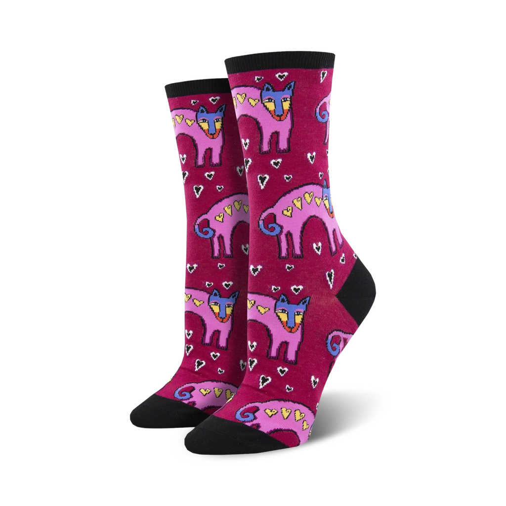 Love dogs and fun mismatched socks? These Heart Dogs socks are for you! Bright pink socks have a pattern of cartoon pink dogs with floppy ears and cute black noses, surrounded by red hearts. Wear these fun, colorful crew socks to show off your playful side and love for your four-legged friends. Fun fact: Did you know that scientists are studying man's best friend for therapeutic purposes? Grab a pair of these paw-some socks to show your support!