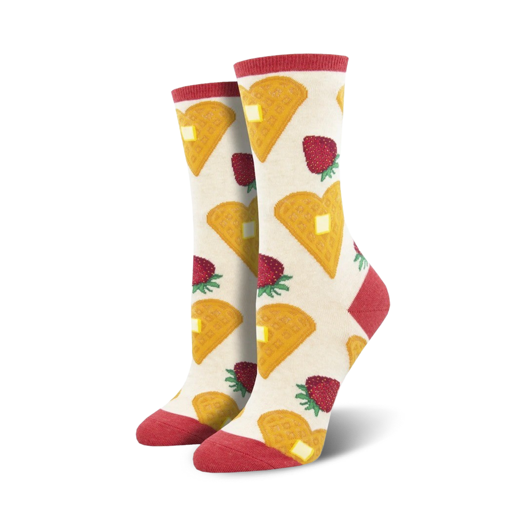 Start your day with a hearty serving of breakfast served right on your feet! These Heart Smart Breakfast socks feature a pattern of heart-shaped waffles topped with juicy strawberries and pats of butter. They're sure to get you craving a stack of pancakes and a cup of coffee! Perfect for those lazy mornings when you just want to stay in bed and have breakfast in bed minus the mess. Show off your love for waffles and all things breakfast with these fun and delicious socks.
