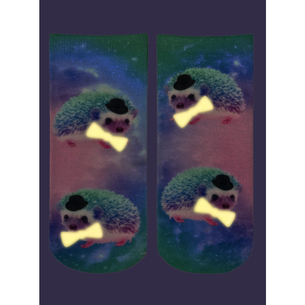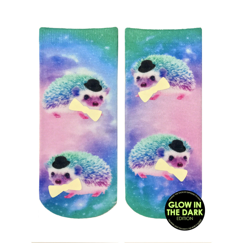 These 'Hedgehog Glow' socks are seriously cute. They're ankle socks with a pastel galaxy background - think pinks, blues, and greens swirling together. The visible design features adorable hedgehogs in tiny top hats and bow ties. The hedgehogs themselves seem to glow in the dark, based on the product title. They're a fun, whimsical way to add a little something extra to your outfit. Prepare for compliments!