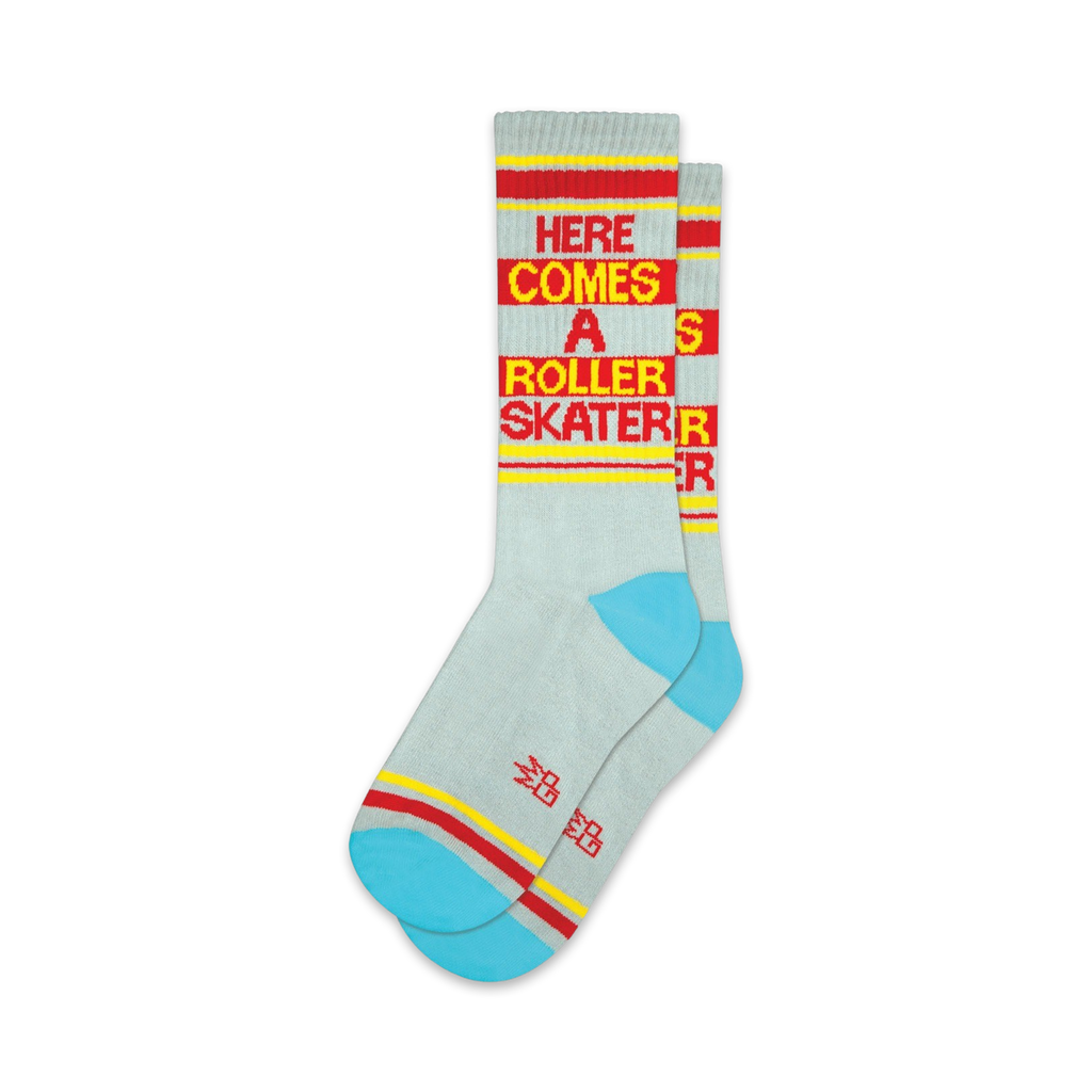 Get ready to roll into style with our Here Comes A Roller Skater Gym socks! These light gray crew beauties will have you gliding through the day with their blue toes and heels that'll make you feel like you're living on cloud 9. Plus, the bold red and yellow lettering on the front spells out "Here Comes A Roller Skater," so everyone can catch your moves. So, grab a pair and lace up your skates, because fashion and fun are about to take a wild ride!