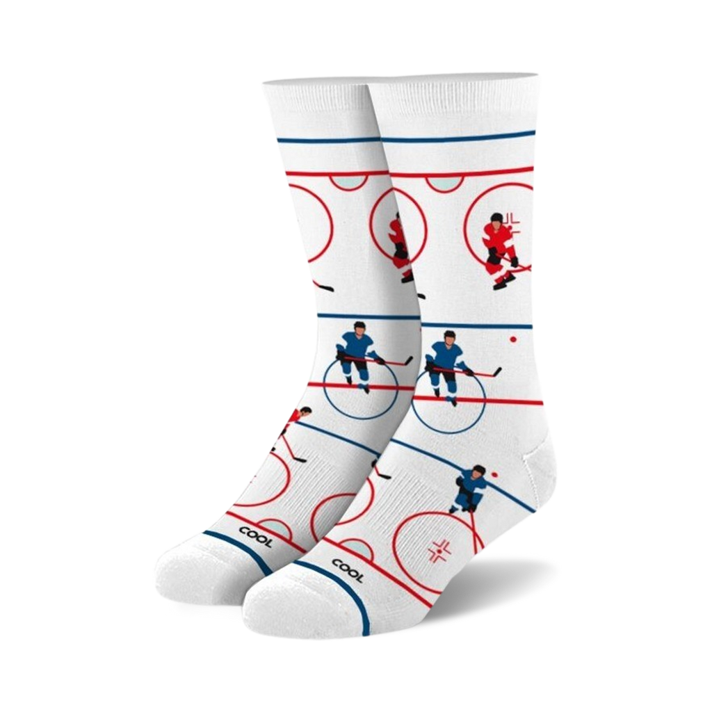 Add a dash of ice into your style with our Hockey-themed socks! These unisex crew socks feature a vibrant blue and red design of hockey players on a rink. Lace up these bad boys and get ready to score style points wherever you go. This design is sure to be a hit with any hockey fan!
