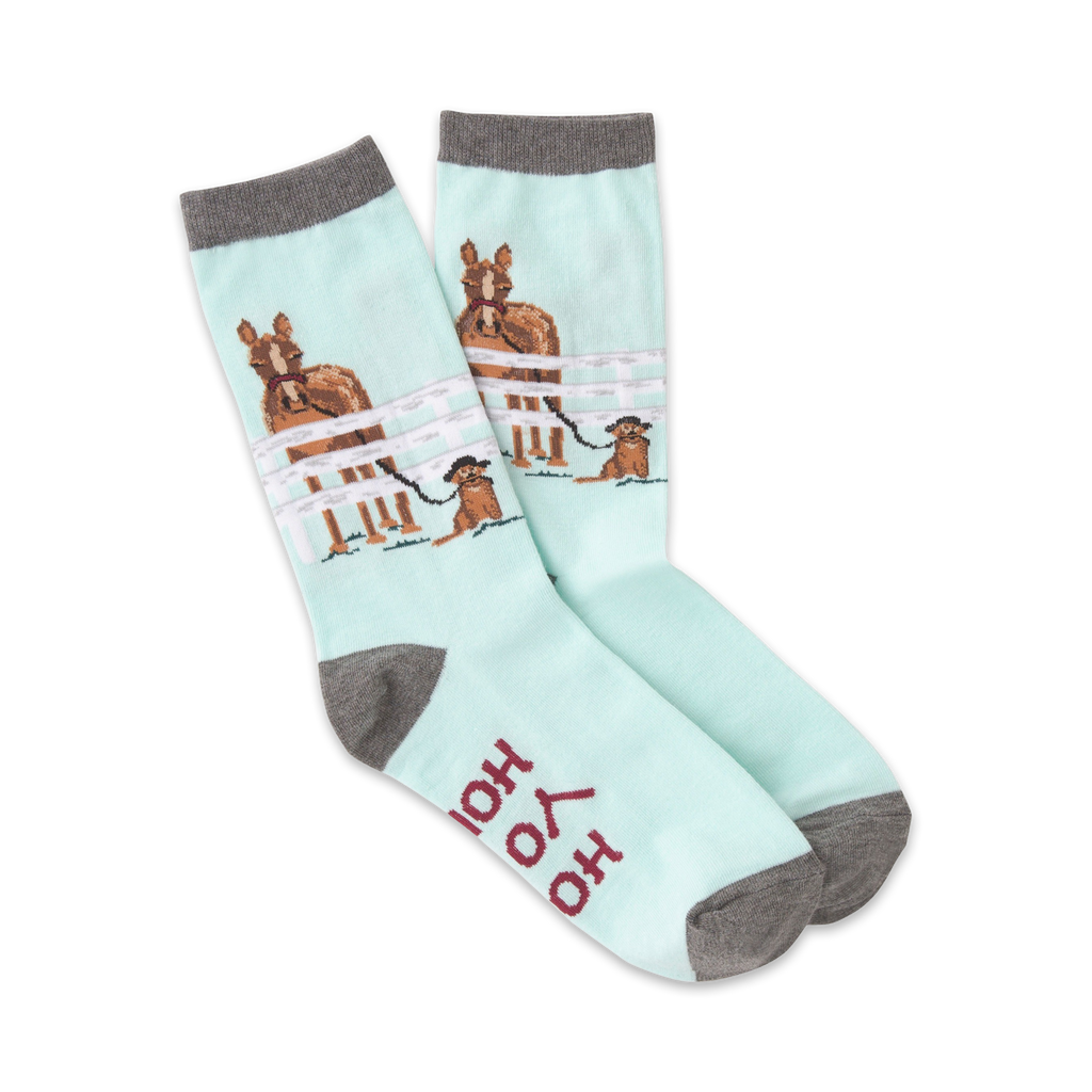 Are you looking for a stable relationship? Are you tired of horsing around? Need a mane boo? Whoa, there! This cool pair of light blue crew socks features an onlooking horse with his reins being held by a cute pup. On the underside of the foot is the phrase "Hold your horses". These awesome socks would make a great gift to horse and derby fans!