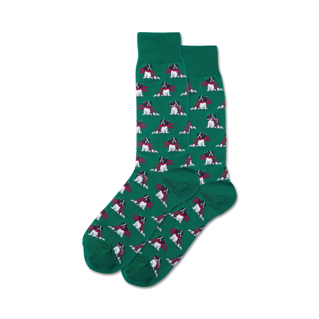 Calling all dog-loving enthusiasts! These Holiday Dog socks will have you paw-sitively merry this Christmas season! Featuring a festive pattern of cartoon canines adorned in red scarves against a backdrop of deep green, these crew-length socks for men are the perfect way to spread holiday cheer wherever you go. With their playful design and comfortable fit, these socks will make you the talk of the town - or at least of your next ugly Christmas sweater party! So go ahead, give your feet the gift of canine cuteness this holiday season with Holiday Dog socks!
