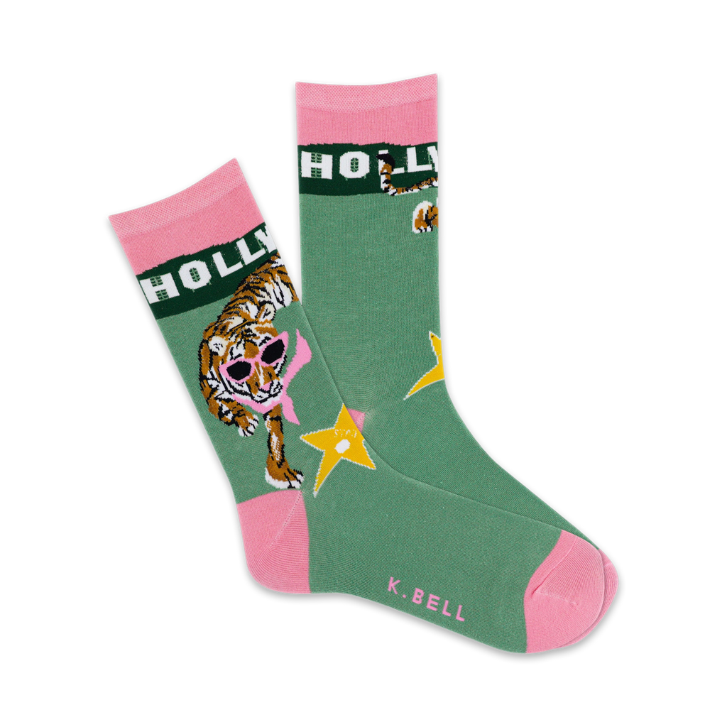 Grab a pair of Hollywood Tiger socks and step into the spotlight! These crew socks for women are a star-studded sensation, featuring a green background with pink stars and a chill tiger wearing shades, standing tall on a white star. With the word "Hollywood" emblazoned across the top, these socks are perfect for anyone who dreams of the silver screen.