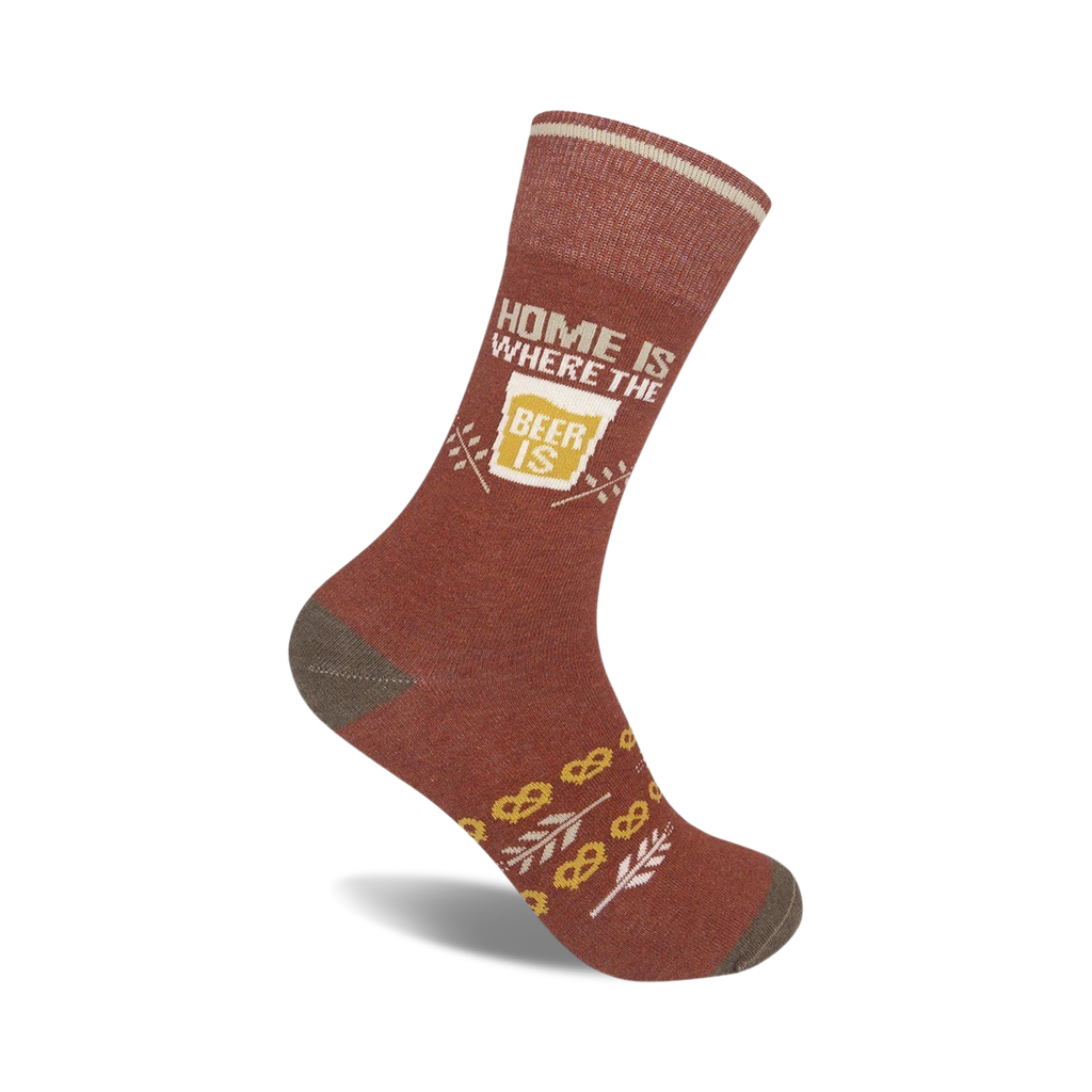 Pretzel Patterned Beer Socks: Where Beer and Fashion Collide! Kick back and relax with a frothy beer while rocking these quirky pretzel and wheat patterned socks. The phrase 'Home Is Where The Beer Is' proudly displayed on these brown and off-white socks is sure to spark conversations at your next beer tasting party. Put these on and let the good times flow!