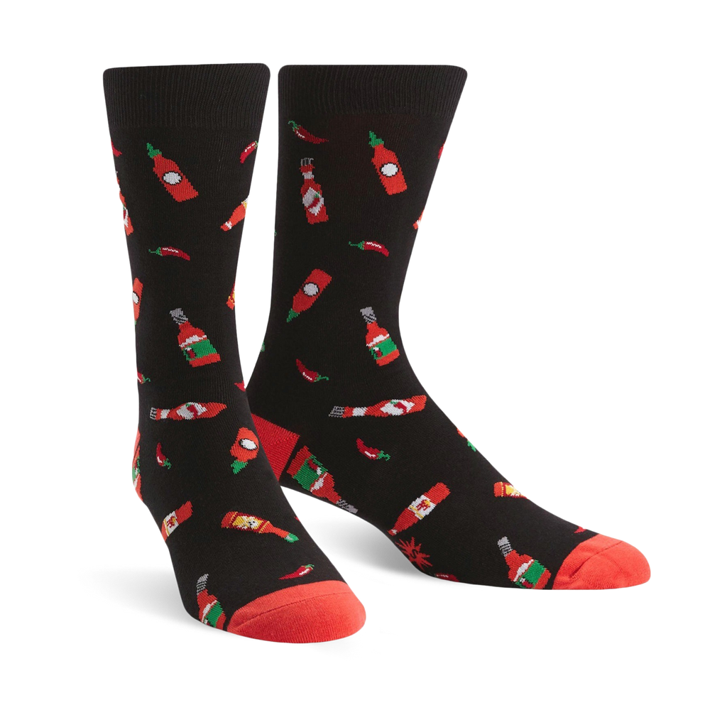 Spice up your sock game with our hot sauce socks! Featuring a fiery pattern of chili peppers and hot sauce bottles in vibrant red and orange hues, these socks will add a touch of fun and spice to your everyday look. Slip on a pair of these mouthwatering socks and feel the heat all day long.