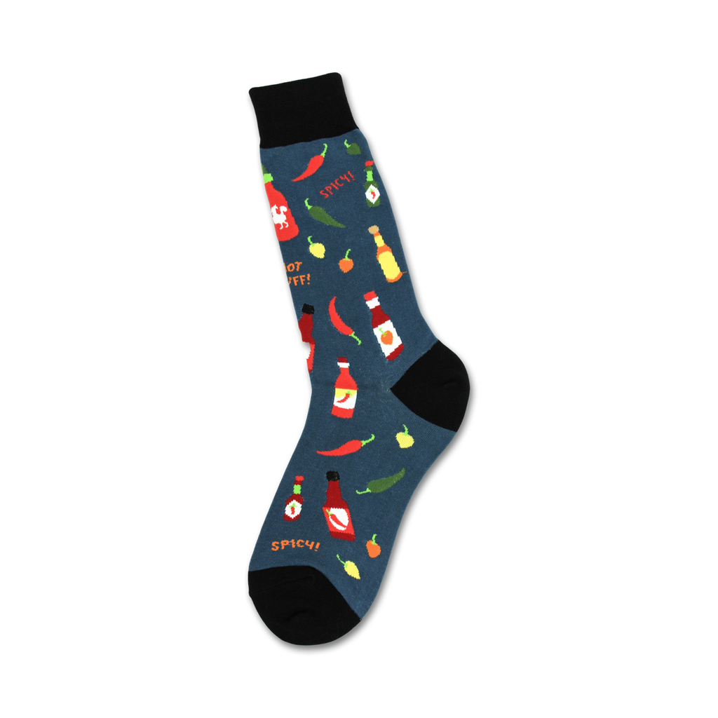 Kick your feet up in some spicy style with our Hot Sauces Socks! These crew socks for men feature a pattern of hot sauce bottles and chili peppers on a blue background, topped with "Hot Sauces" in bold white lettering. It's the perfect way to spice up your wardrobe, whether you're a chili head or just love a good pun.