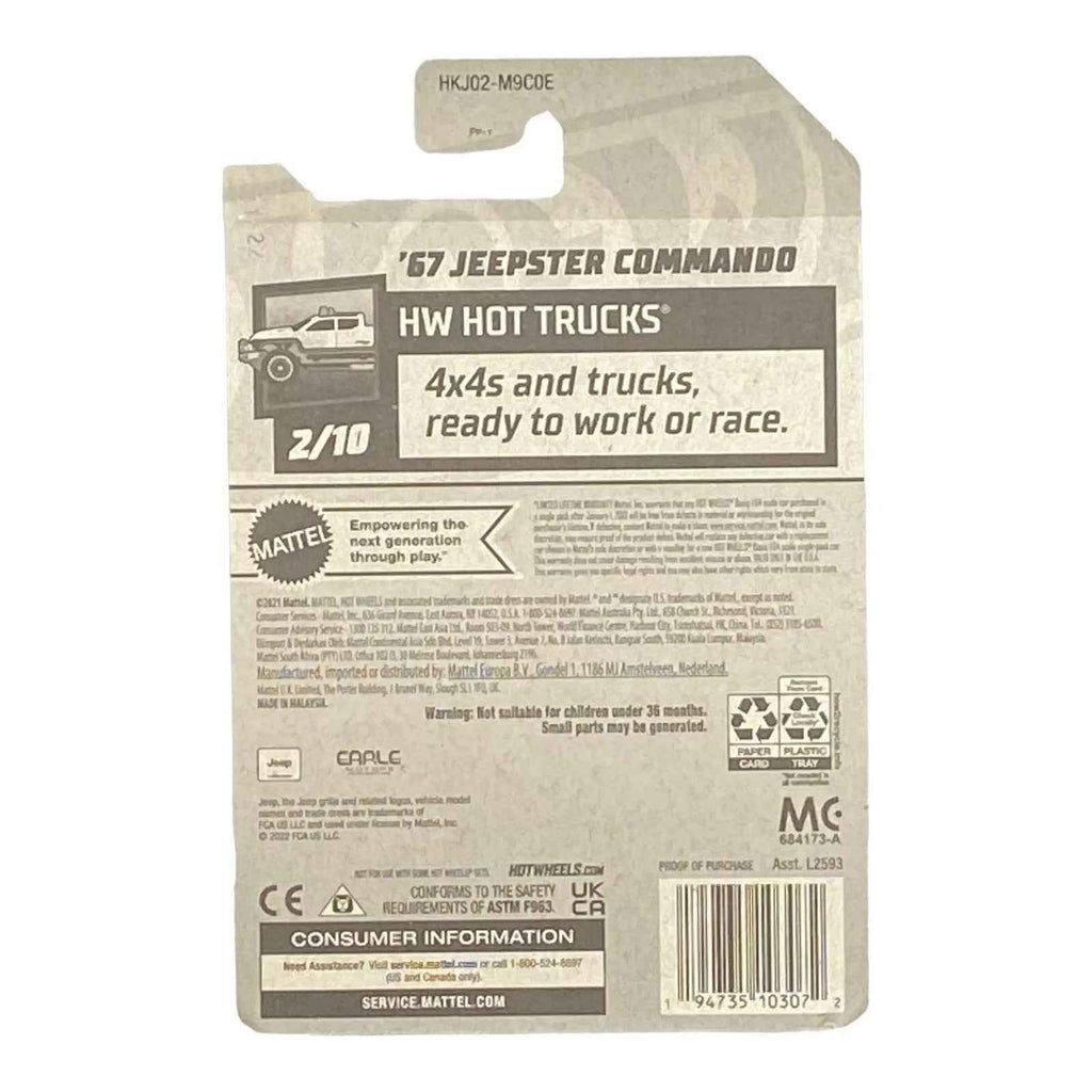 Hot Wheels '67 Jeepster Commando is an amazing die-cast model that captures the spirit of adventure and style associated with classic vehicles. The Hot Wheels '67 Jeepster Commando, part of the highly sought-after Hot Trucks Series 2/10, is a must-have for car enthusiasts and collectors alike. With its vibrant colors, detailed design, and iconic features, this collectible brings the classic Jeep experience right to your shelves or display cases.