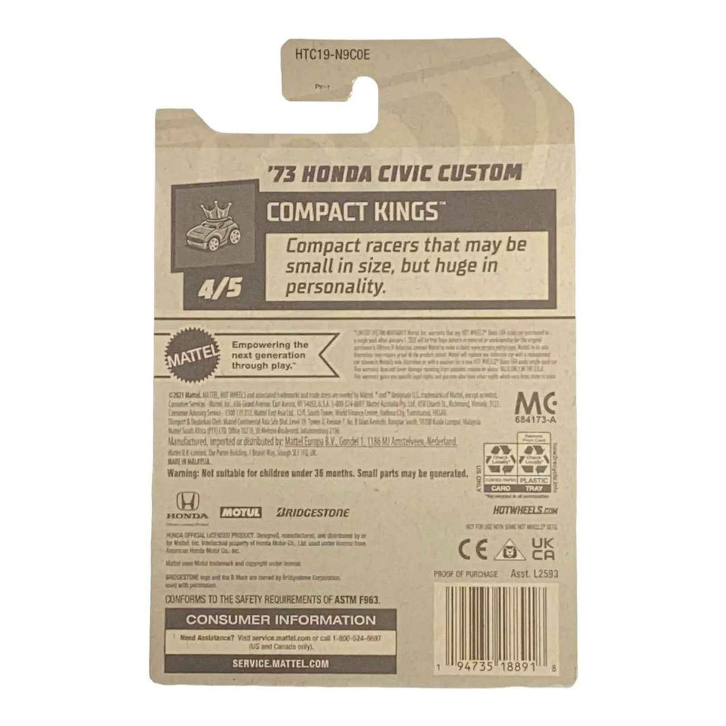 Introducing the Hot Wheels '73 Honda Civic Custom, a stunning addition to the Compact Kings Series. This exceptional die-cast model brings to life the iconic design and spirit of the 1973 Honda Civic, making it a must-have for collectors and enthusiasts alike. With meticulous attention to detail, this model captures the essence of the original car while offering a modern twist that will captivate fans of all ages.