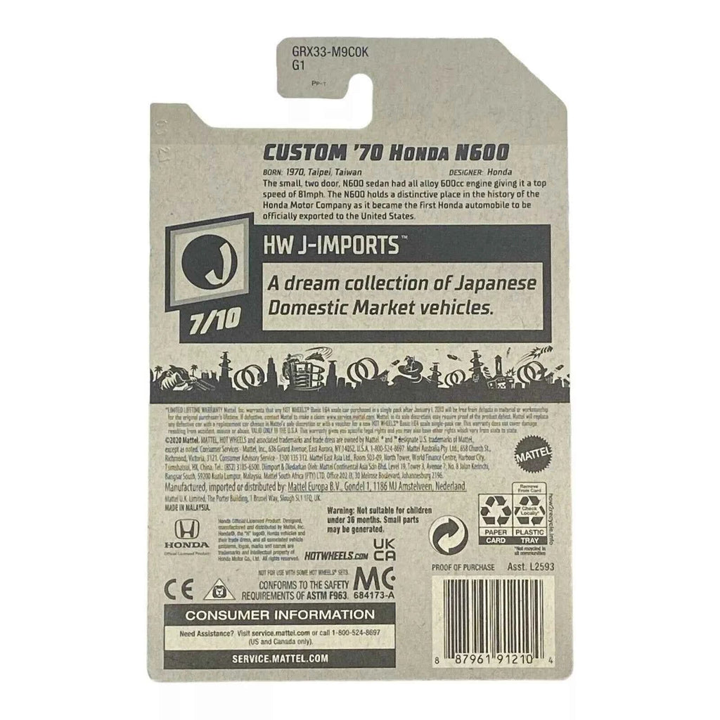 The Hot Wheels Custom '70 Honda N600 is an iconic addition to the J-Imports Series, capturing the essence of Japanese automotive design and innovation. This model, embodying a unique style, stands out with its vibrant colors and detailed craftsmanship. As part of the 7/10 in the series, it celebrates the legacy of Honda and its impact on car culture. With its appealing design and impressive performance, the Hot Wheels Custom '70 Honda N600 is a must-have for collectors and car enthusiasts alike.