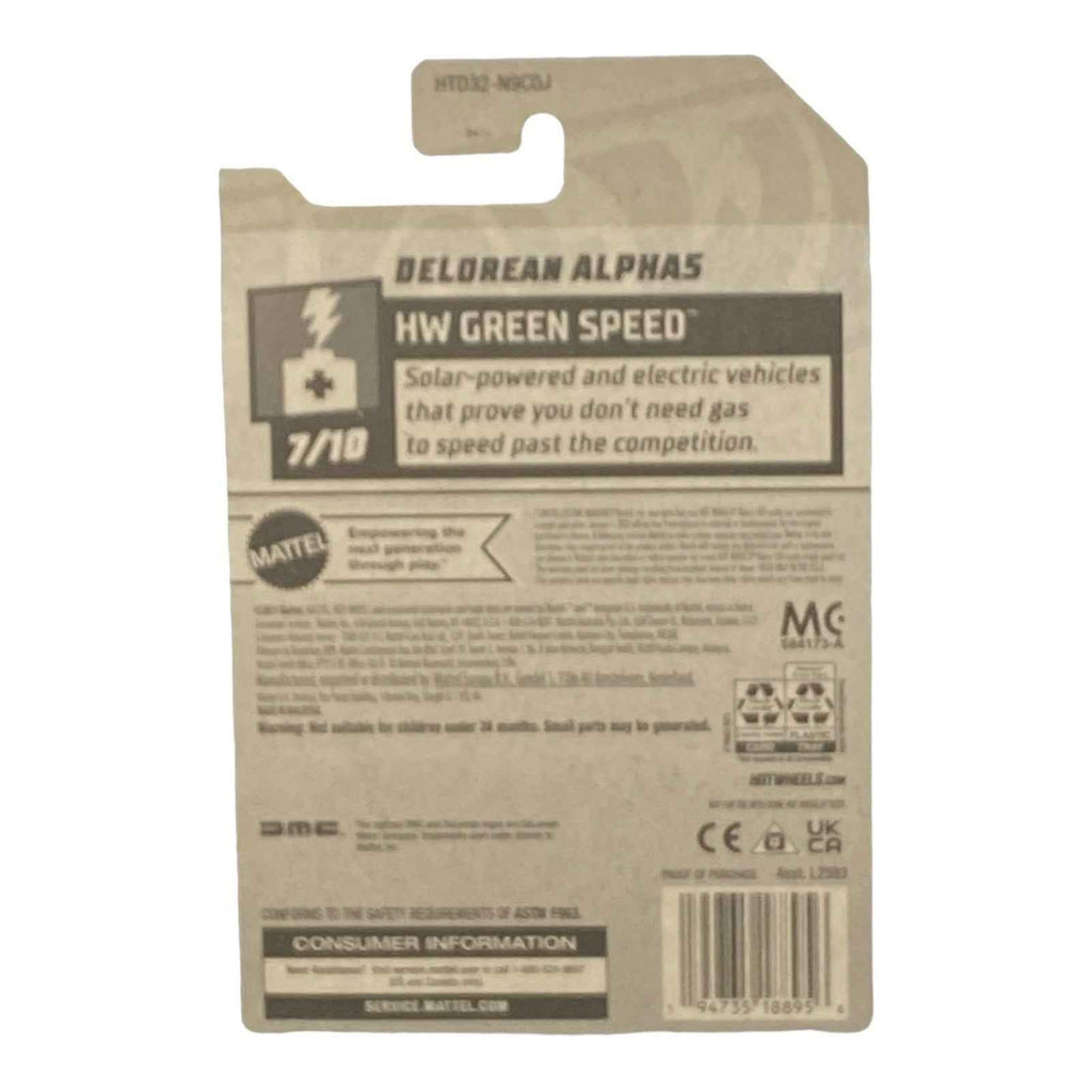• Authentic Design: The Hot Wheels DeLorean Alpha5 features an authentic design that mirrors the original vehicle's aesthetic, incorporating unique elements that set it apart in the Green Speed Series.