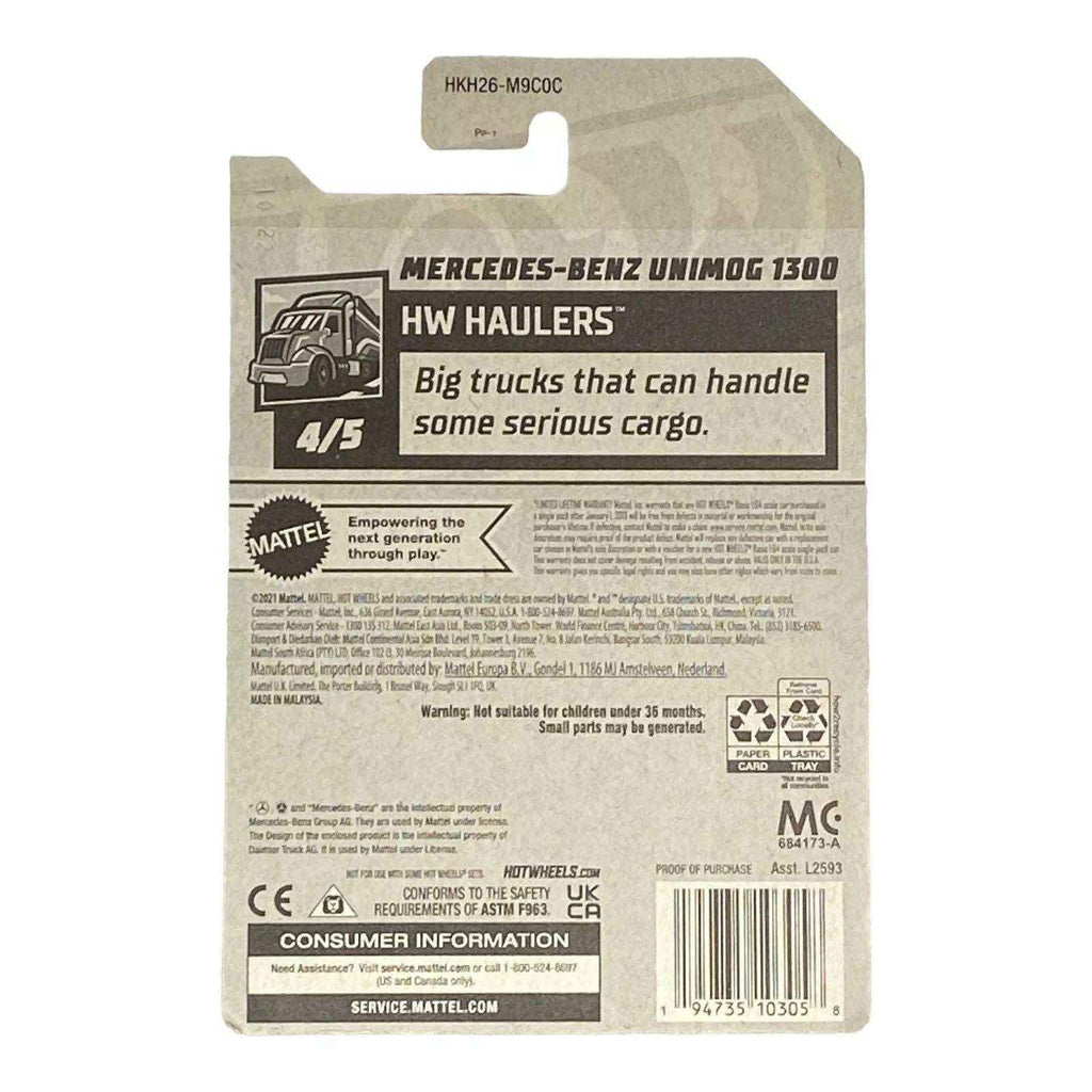The Hot Wheels Mercedes-Benz Unimog 1300 is an exceptional model that captures the rugged spirit and engineering excellence of the original vehicle. This die-cast collectible, part of the Haulers Series, is a perfect addition for enthusiasts and collectors alike. With its distinctive design and attention to detail, the Hot Wheels Mercedes-Benz Unimog 1300 stands out in any display.