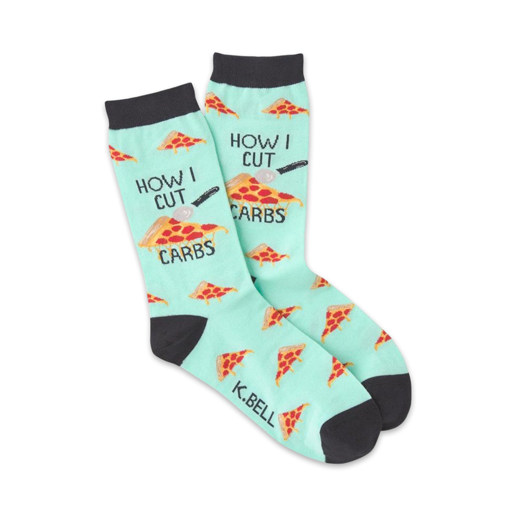 How I Cut Carbs are the cheesiest socks you'll ever wear and they won't add an inch to your waistline! Get ready to work out in style with these pizza-patterned crew socks for women. The socks feature the text '{How I Cut Carbs}' for an extra dash of cheesy motivation.