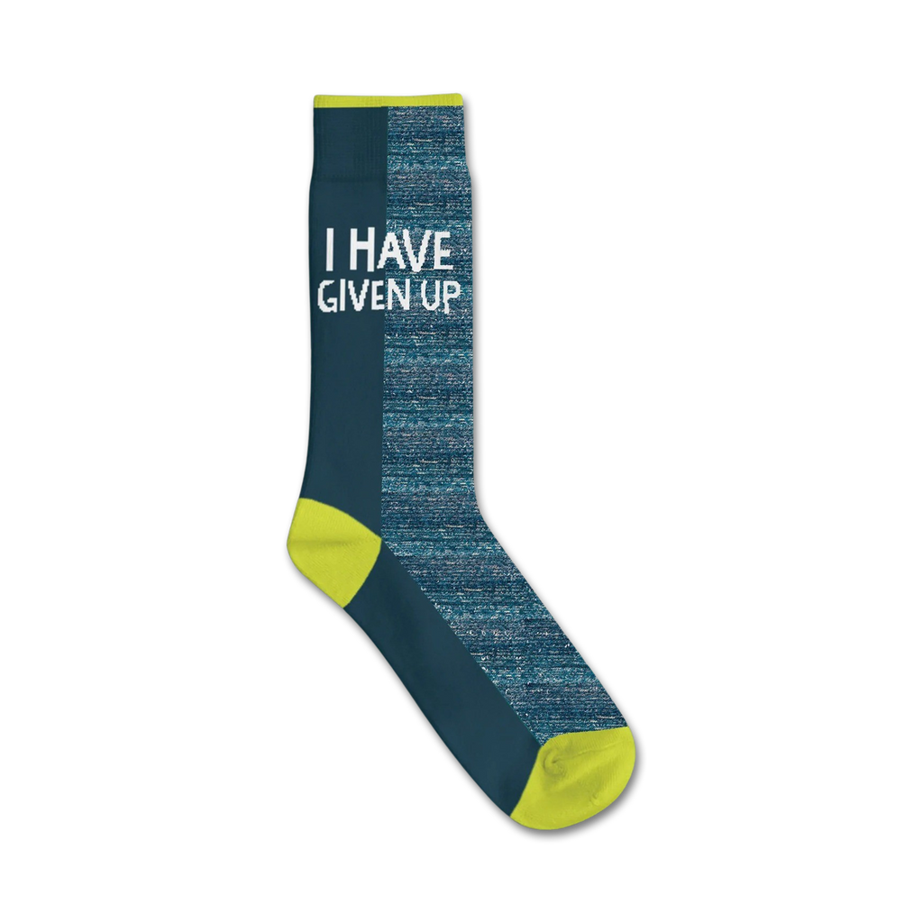 Say "I have given up" with these sassy and fun crew-length socks for men. The dark blue socks have bright yellow toes and heels. These socks are a great way to tell the world you're fed up, done, kaput! The left sock says, "I have", and the right sock says, "given up."