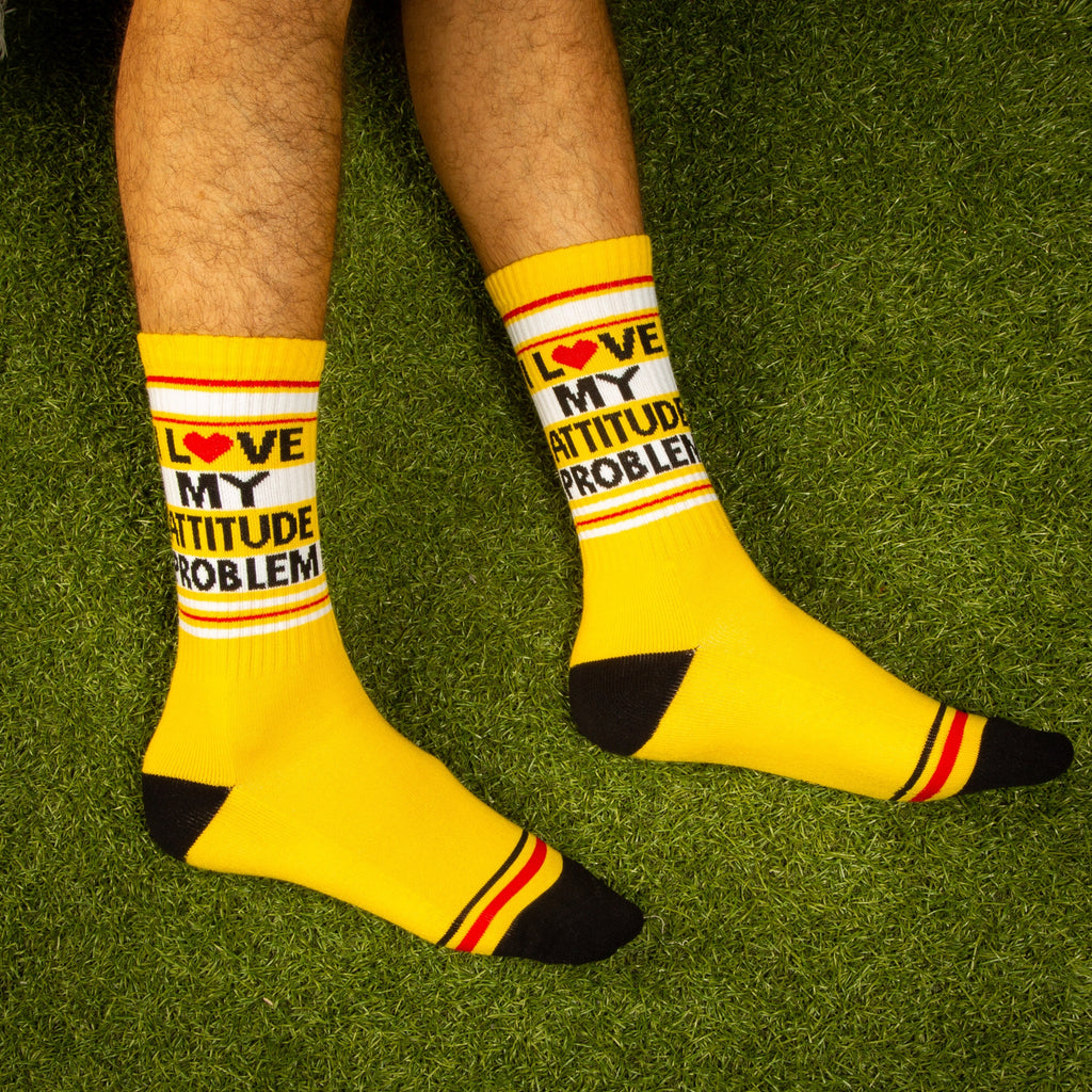 Get ready to sock it to 'em with our "I Love My Attitude Problem" footwear! These aren't just any socks; they're a vibrant blend of yellow, black, red, and white, guaranteed to add a pop of color and a dash of sass to any outfit. Perfect for those days when you're feeling a bit cheeky, they'll hug your feet with a cozy embrace while silently shouting, "Yes, I'm fabulous, and I know it!" Let your feet do the talking and strut your stuff with confidence. After all, who says socks can't have a little fun too?