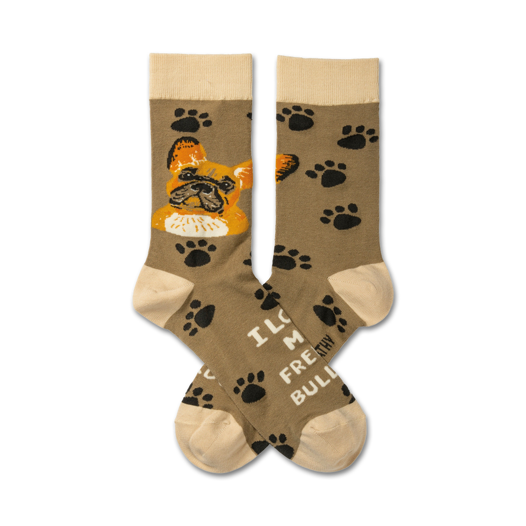 Talk about paw-some! These brown crew socks feature a cartoon French Bulldog on one sock and the words I love my Frenchie  on the other. Whether you're a Frenchie owner or just a fan of these adorable dogs, these socks are sure to make you smile. Plus, they're made for both men and women, so you can share the Frenchie love with everyone.