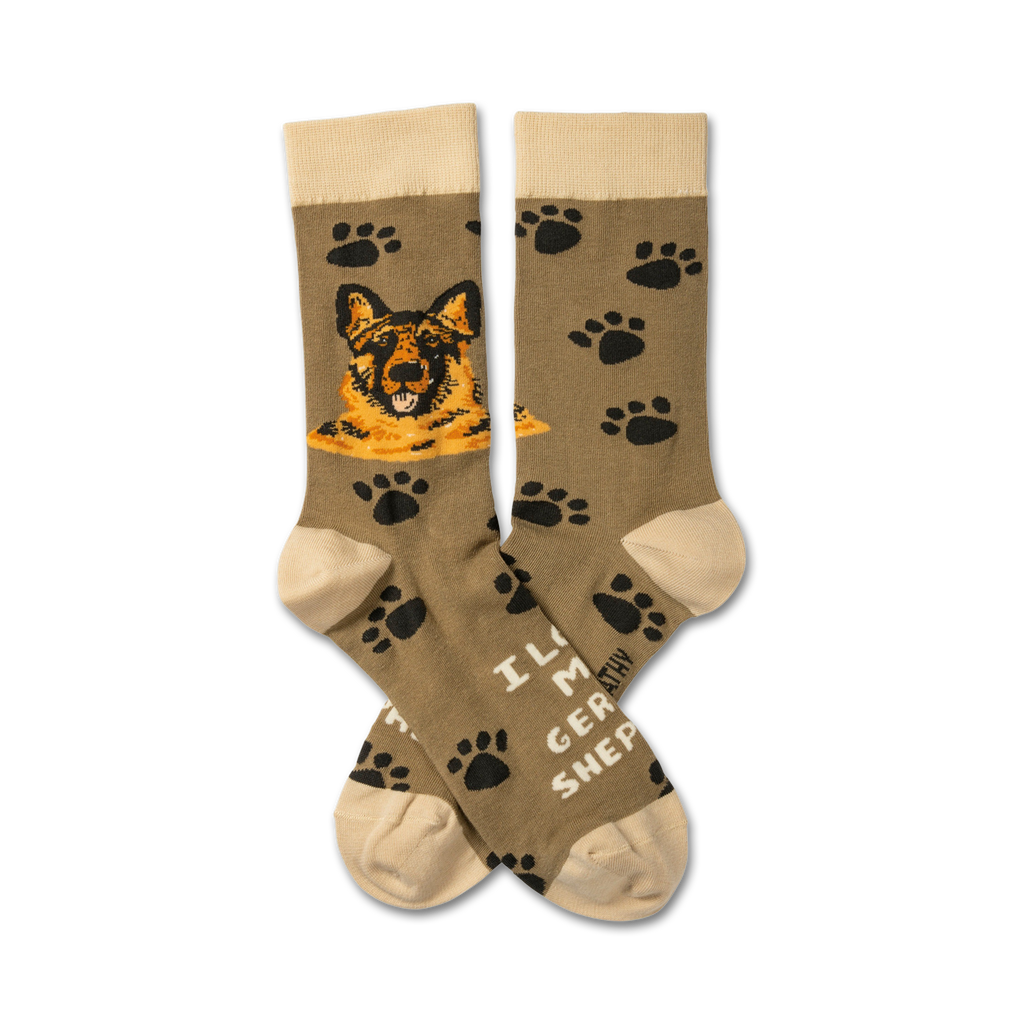 Paw some style walk your way with our 'I Love My German Shepherd' socks! Featuring a charming brown background adorned with adorable black paw prints, these socks are sure to put a smile on your face and anyone who sees them. To top it off, they proudly display "I My German Shepherd" above a cute German Shepherd image, making them the perfect gift for any dog lover or German Shepherd owner. Get ready to show off your love for your furry friend with every step you take!