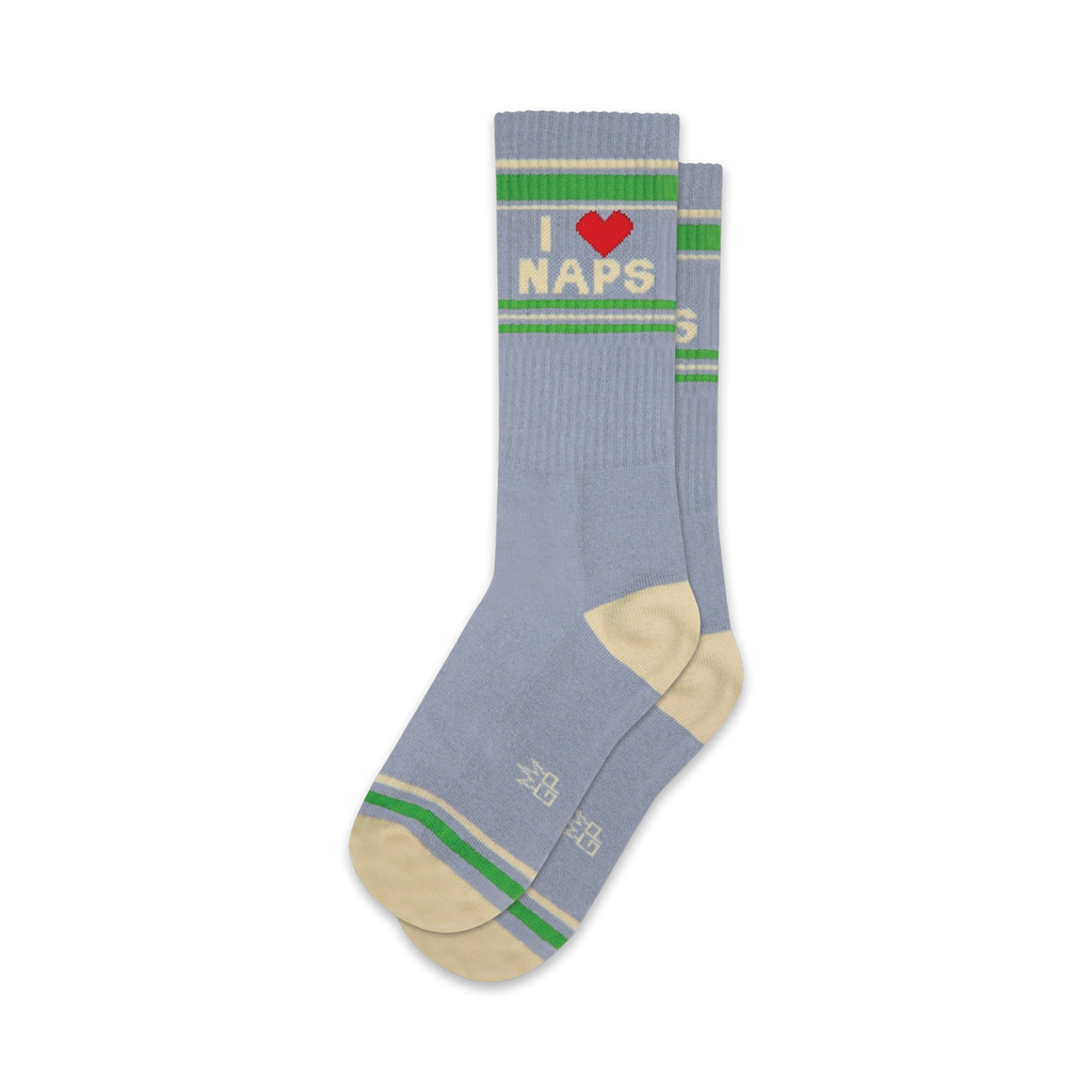 Show off your passion for power naps with these bright blue, green and red socks with the words "I Love Naps" covering them from top to bottom. Dedicated to the art of snoozing, these socks are like tiny love letters to your favorite sleeping position. Since hearts and naps go hand in hand, we added some as a bonus. Grab a pair today and show the world that catching Zs is your favorite activity.