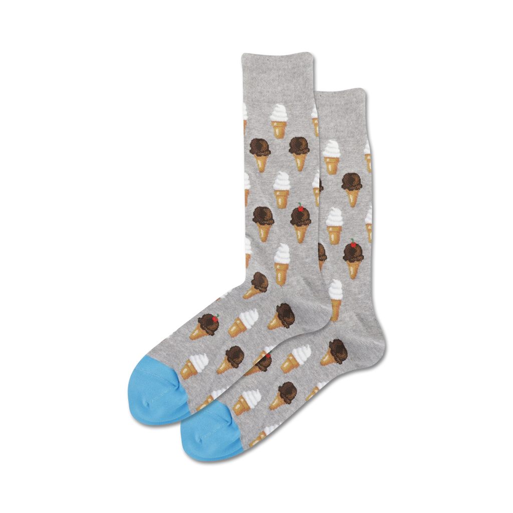 Need a SERIOUSLY COOL way to beat the HEAT this Summer? Ice Cream to the rescue! These gray, ice cream cone-patterned socks have more FLAVOR than popsicles on the 4th of July! With cones & frosting in brown and white and toes in BLUE, these crazy kicks are a sweet treat for your feet!