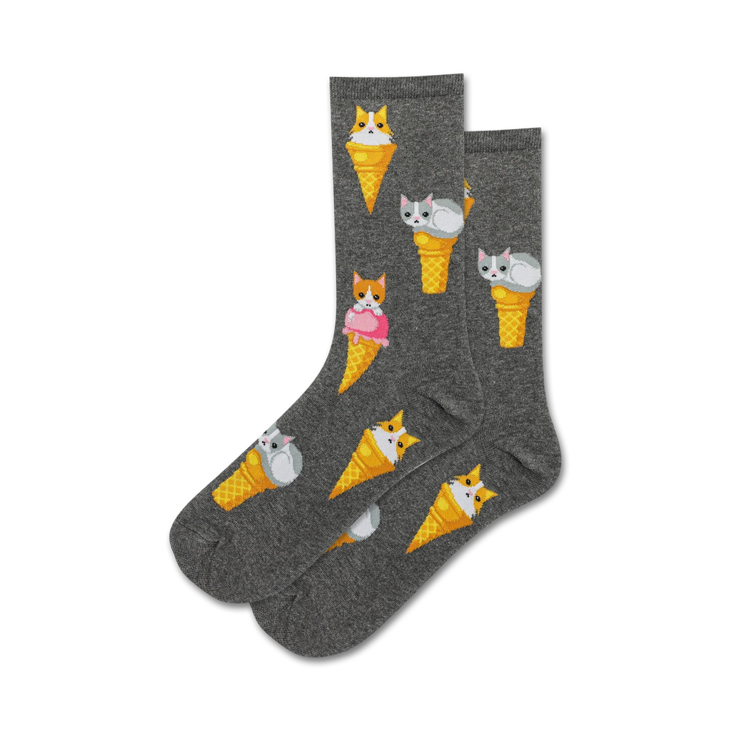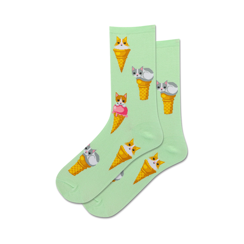 Have a scoop of fun with these Ice Cream Cat socks stylish, sweet, and deliciously durable. The crew-length socks feature pixelated felines served in ice cream cones. They'll sprinkle your day with smiles and remind you to be cool like the cool cats you're wearing! Treat your feet with a dash of quirky kitty cuteness.