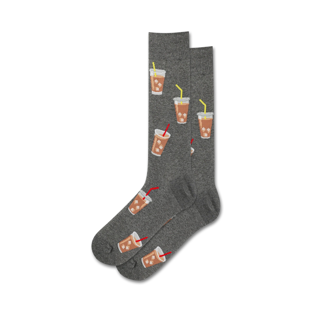 A refreshing pattern of iced coffee drinks covers these grey crew socks. Each clear cup visible on this side holds a light brown beverage with white ice cubes inside. You'll spot some cups with bright yellow straws and others with bold red straws, adding a nice pop of color against the charcoal background. They're a perfect pick for anyone who loves a good cold brew, or just wants to add a cool, casual vibe to their daily look. Imagine wearing these while grabbing your favorite pick-me-up. They're a fun way to show off your laid-back style.