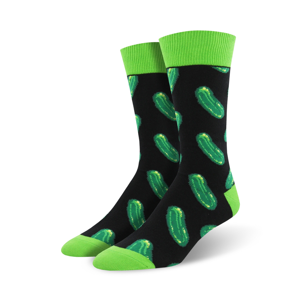 Who says dill can't be a fashion statement? Our crew length socks are the perfect way to add a fun and zesty touch to your everyday style. With an all-over pattern featuring pickle motifs in bright green, these socks are sure to draw attention. Made with reinforced heels and toes, they'll keep your feet comfortable and protected, while reminding everyone that you're the big dill!