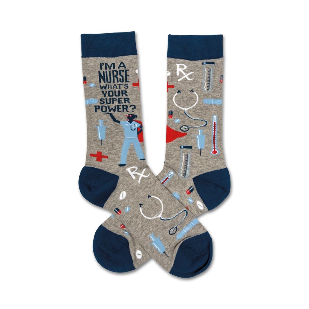 A super comfy pair of socks that will make you the life of the ward! Get ready to be the talk of the hospital with these fun and quirky nurse-themed socks featuring the words 'I'm a nurse, what's your superpower?' and images of medical instruments, guaranteed to brighten your day and bring a smile to your patients' faces. Let these socks be your daily reminder that you're an absolute superhero, saving lives and making a difference, one step at a time.