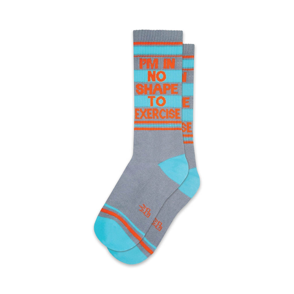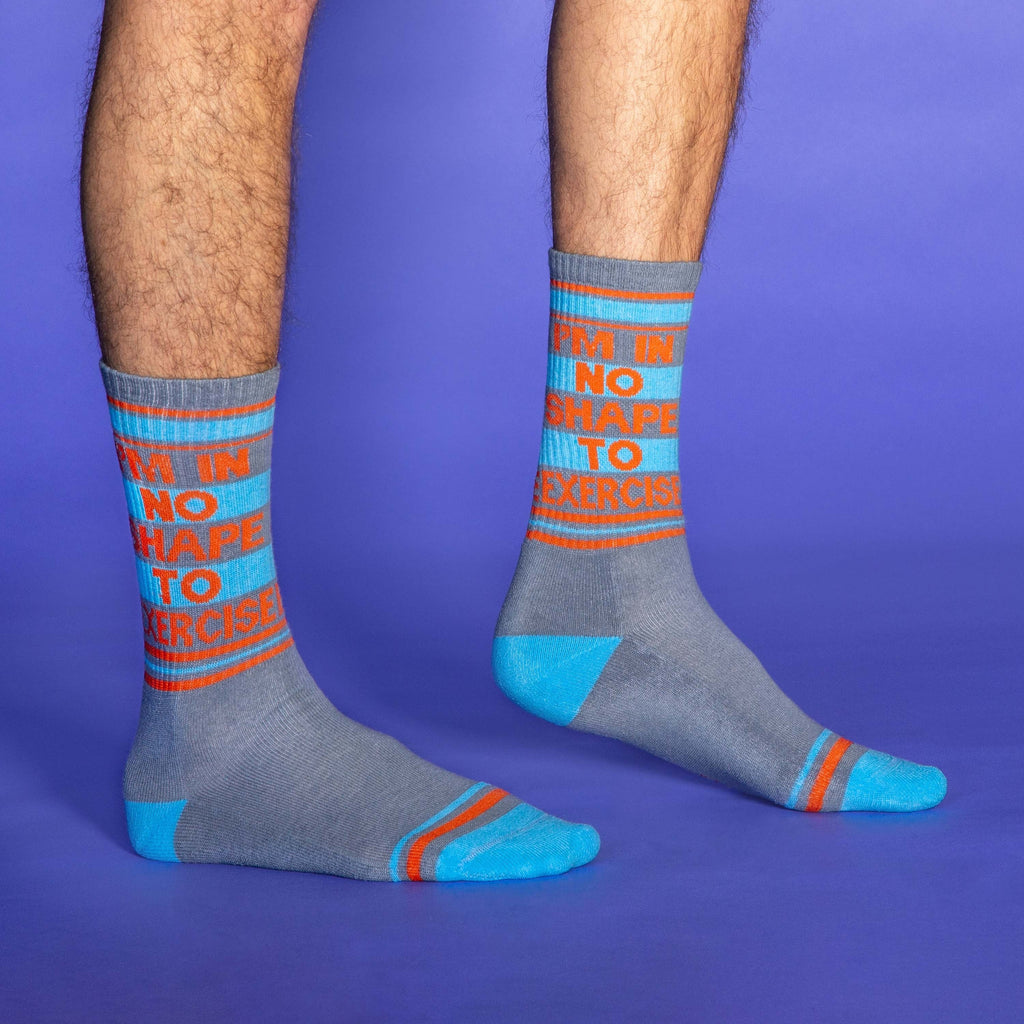 Get ready to kick your feet up or take on the gym with a cheeky twist! Our "I'm In No Shape To Exercise" socks are here to add a splash of humor to your day, whether you're sprinting or just lounging. Decked out in cool gray with snazzy blue and orange stripes, they're the perfect mix of fun and style. Laugh off the gym dread and let your socks do the talking - because who says you can't be hilarious and look good doing it? Ideal for anyone who loves a good giggle with their gear.
